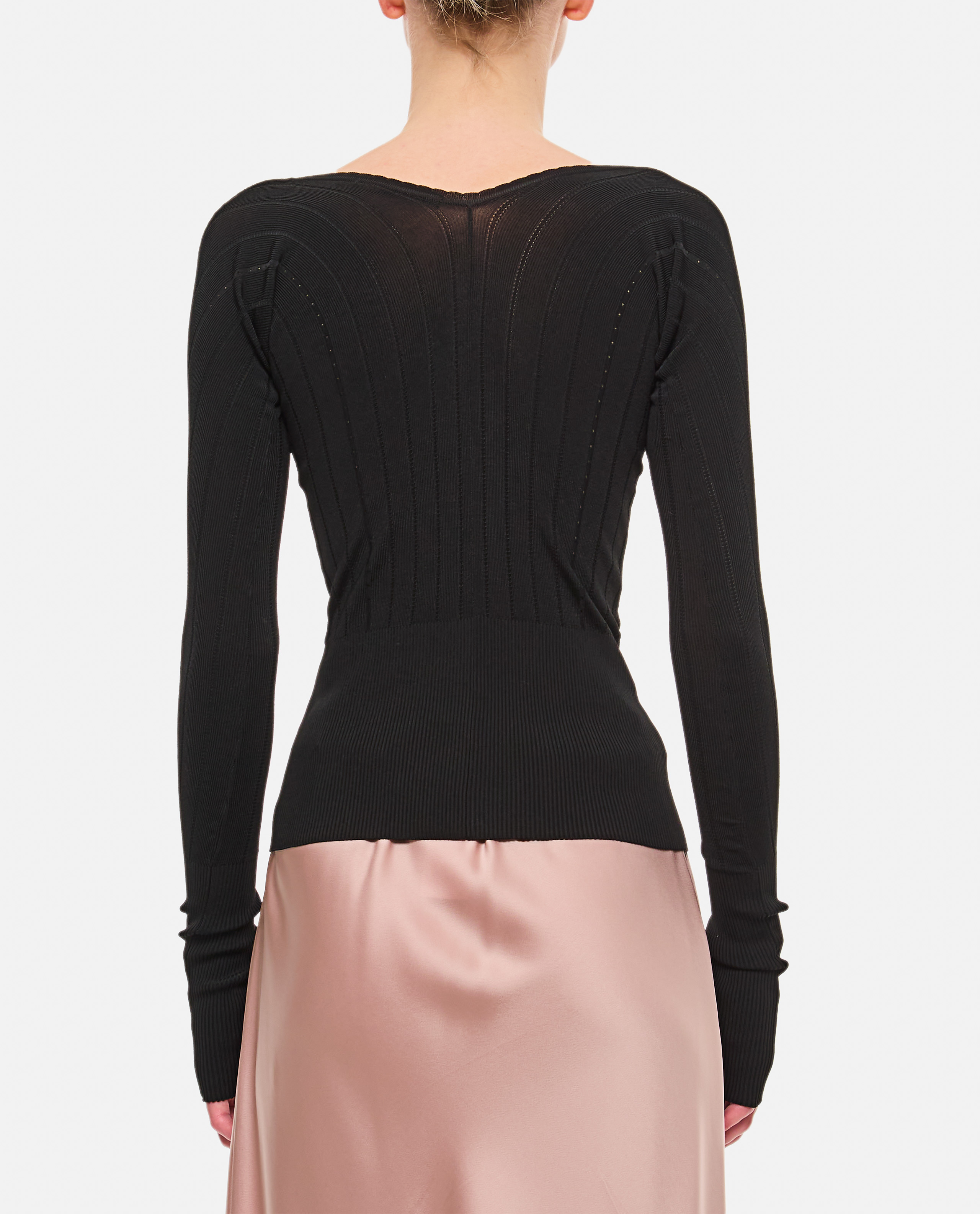 Fitted shape.Rib knit.Open scalloped neckline.Gold metal charm logo with keyhole neckline.Color: black.