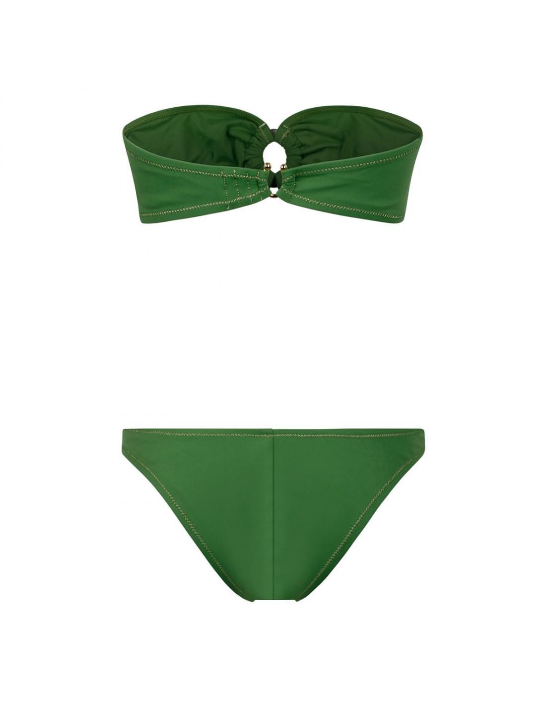Emerald green technical fabric Bandcamp bandeau bikini set from Reina Olga featuring golden metal applique, top with a central ring, rear hook fastening, matching bottom with rings on side.