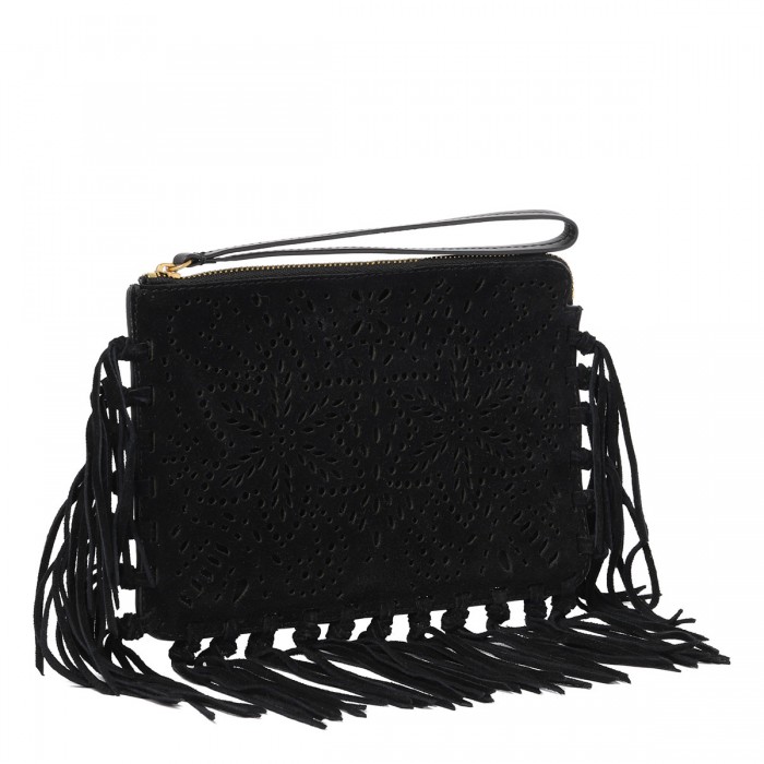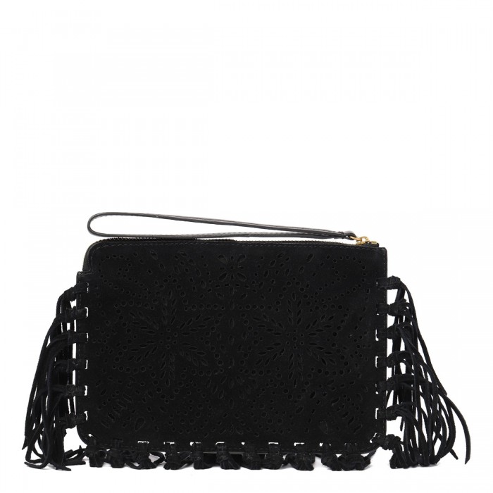 Black perforated suede calfskin leather flat clutch from Isabel Marant featuring fringed trims, gold-finish metal zip fastening, long leather slider, twill lining.
