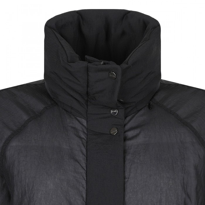 Black tech fabric down parka coat from Herno featuring filling, protective collar, concealed drawstring at waist, long raglan sleeves, concealed front fastening, hidden drawstring at cuffs.