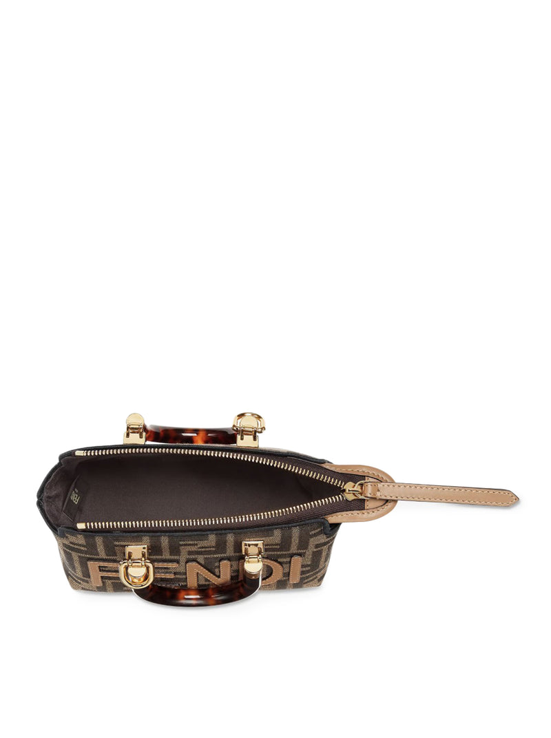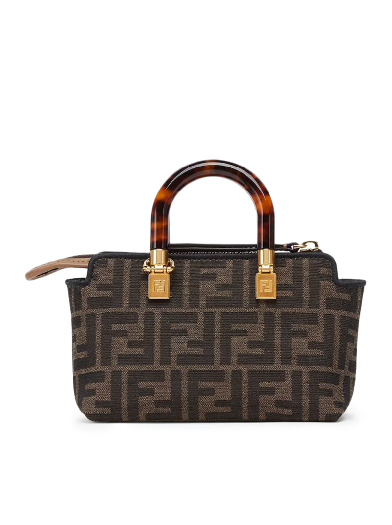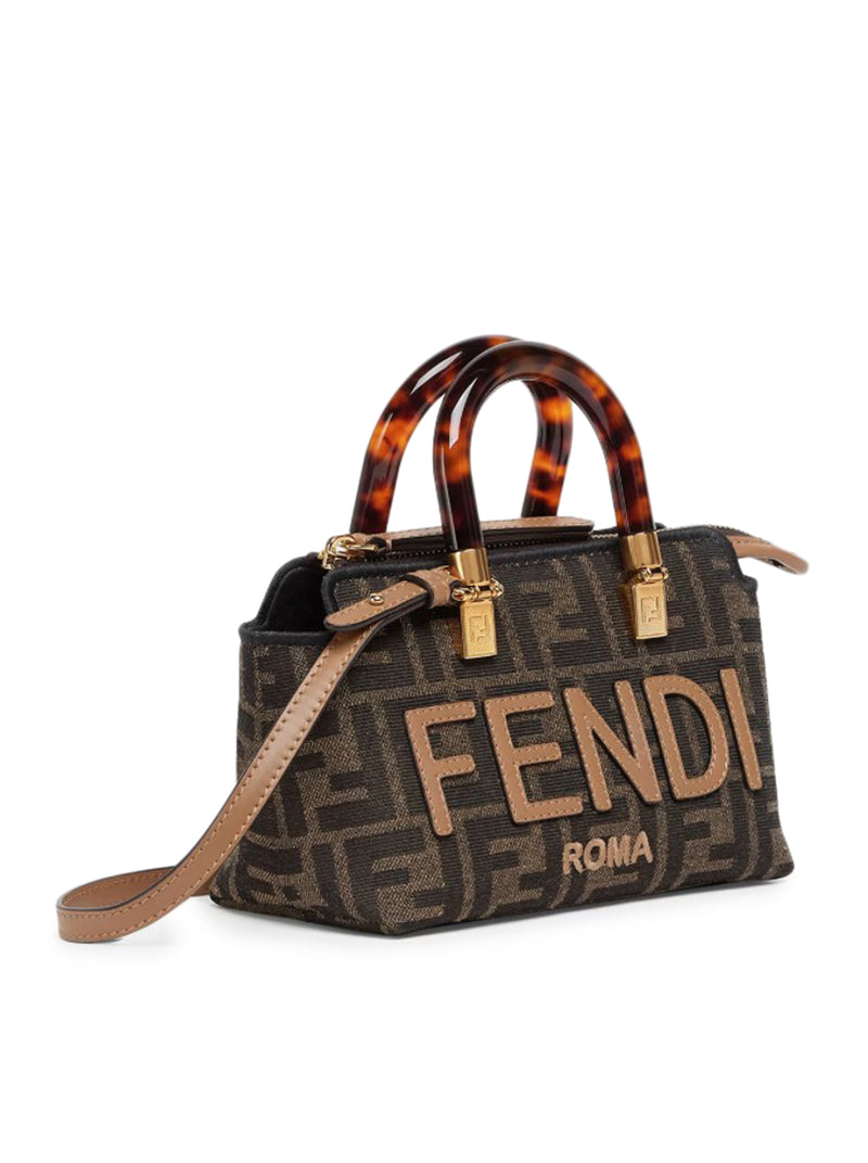 -Iconic By The Way Boston mini bag made of brown FF motif jacquard fabric with FENDI ROMA lettering in beige leather. -Rigid handles in tortoiseshell effect plexiglass. Zip closure. -Features a lined interior with a card holder pocket and gold-finish metal details. -Can be carried by hand thanks to the handles, on the shoulder or worn cross-body thanks to the adjustable and removable shoulder strap. Measurements: -Height: 12 cm -Depth: 9 cm -Width: 20.5 cm -Weight: 0.27 kg -Shoulder strap drop: 62.5 cm