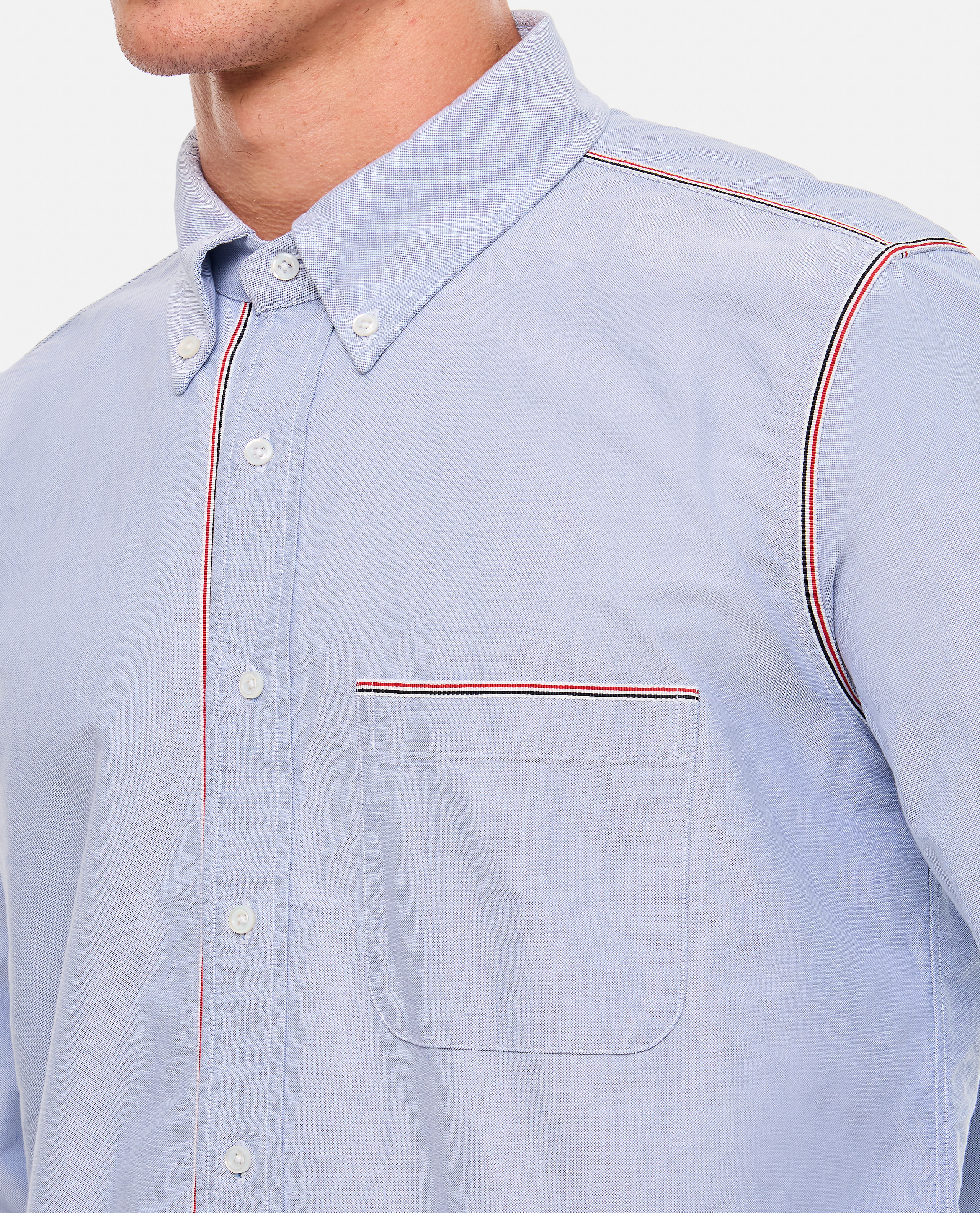 Men's cotton shirt by Thom Browne. Front button closure and chest pocket. Front logo patch detail. Light blue color and straight fit.