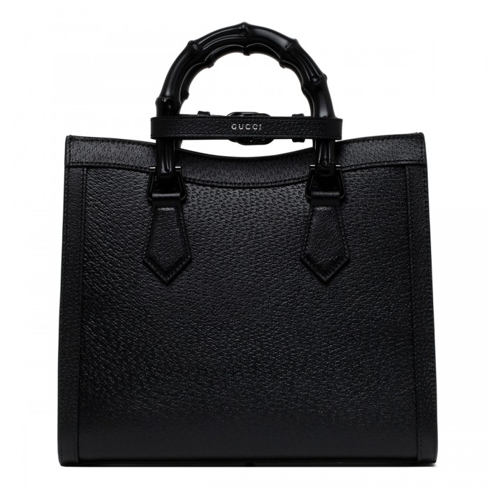 Black leather Diana small tote bag from Gucci featuring black brass double G and hardware, double bamboo handles, two decorative leather belt, double leather handles, adjustable shoulder strap, microfibre suede-effect lining, internal open pocket.