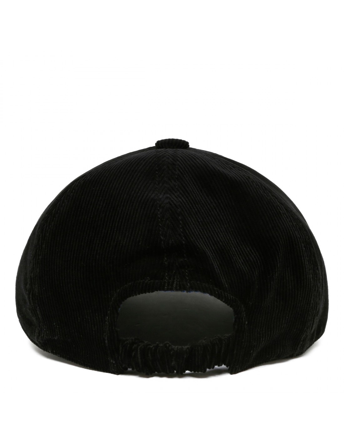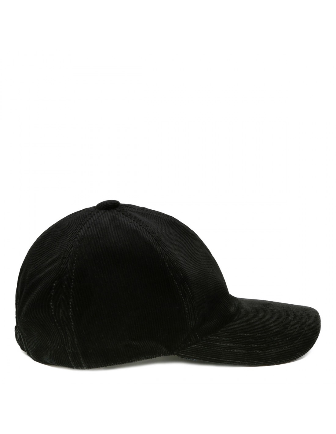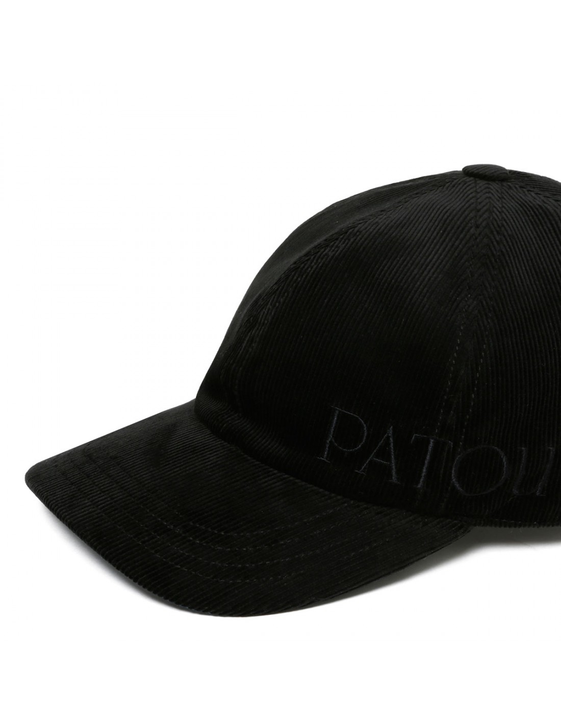 Black corduroy baseball cap from Patou featuring logo embroidered on front, front visor, button on top, elastic back.