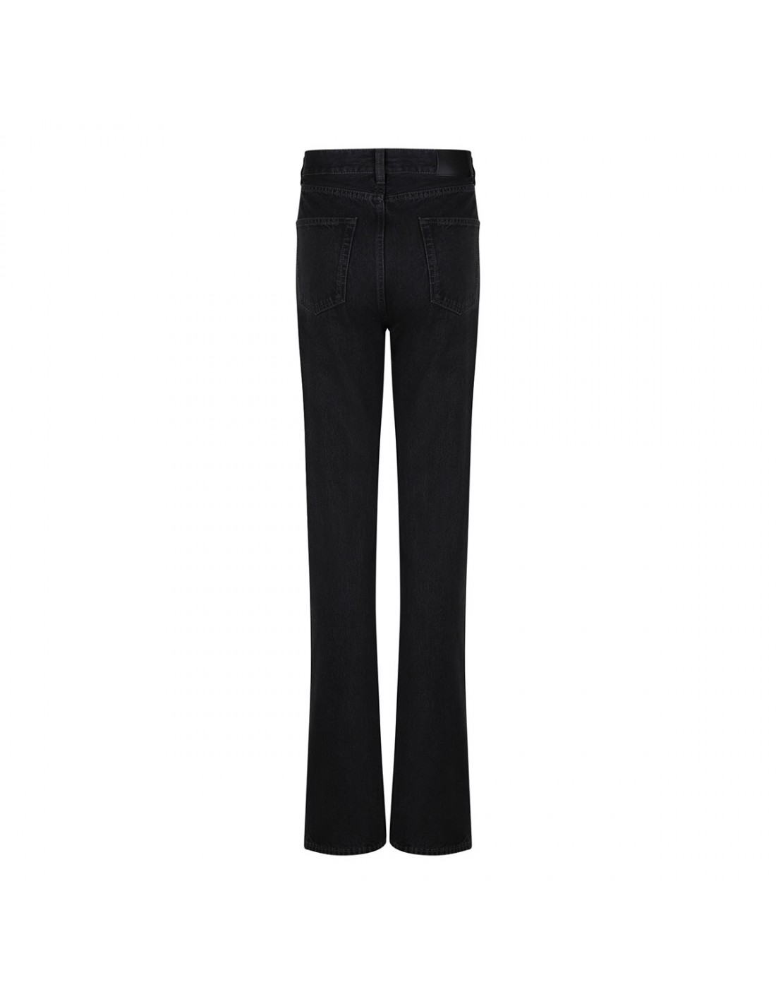 Black denim jeans from Saint Laurent featuring high-waist, slim-fit, classic five-pocket style, long straight leg, button closure and zip fly, belt loops at waistband.