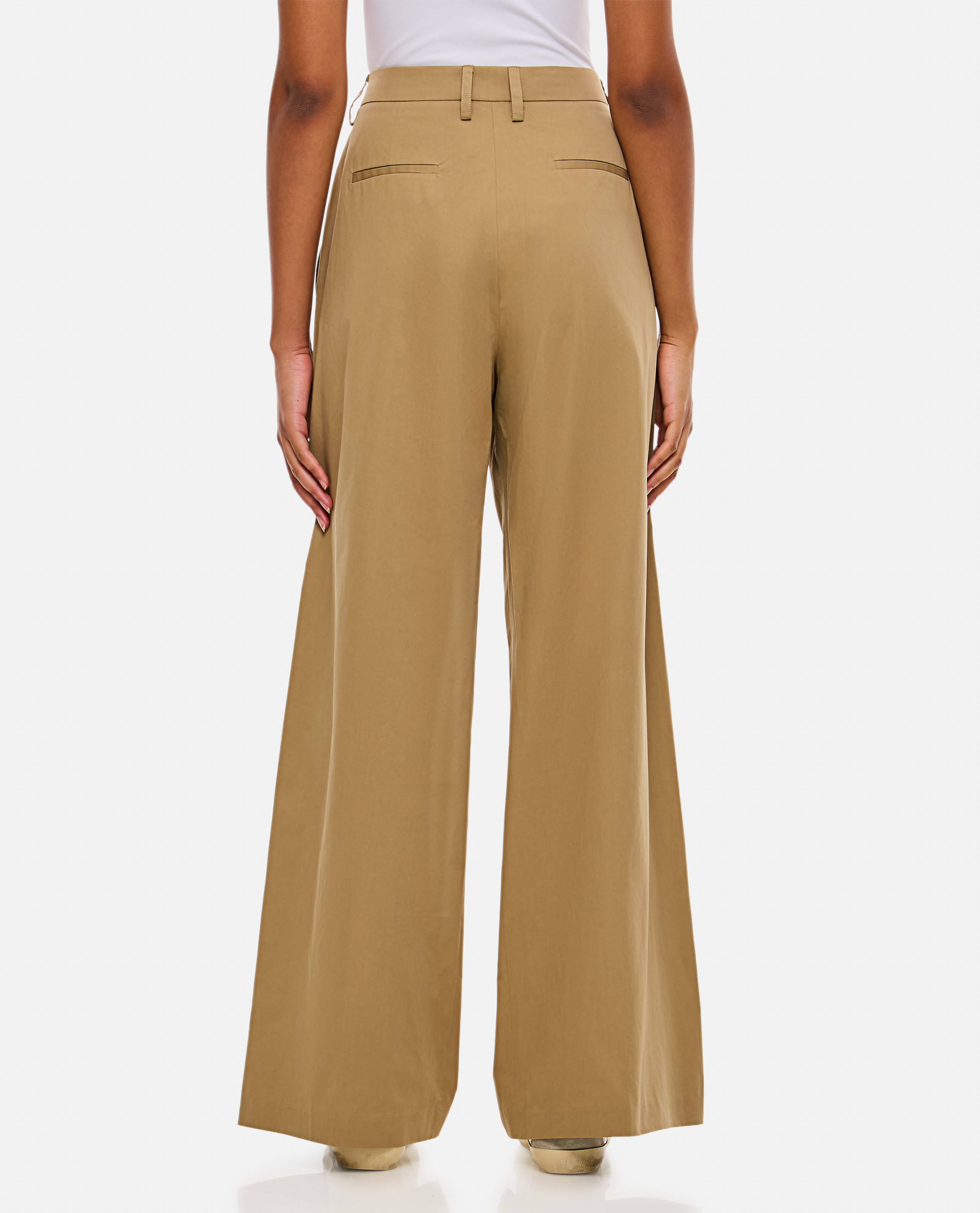 High waist.Pleated front.Two side pockets.Belt loop.Concealed hook and zipped closure.Full lenght.Color: beige.