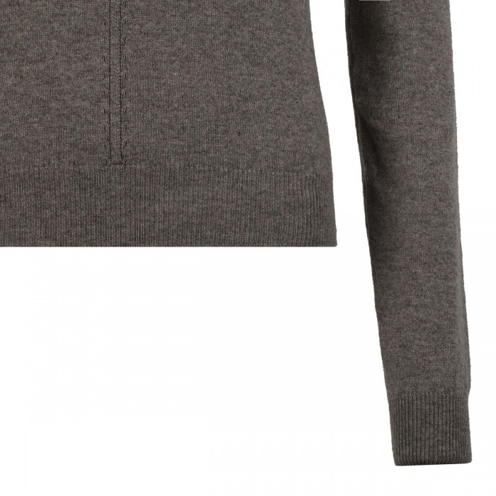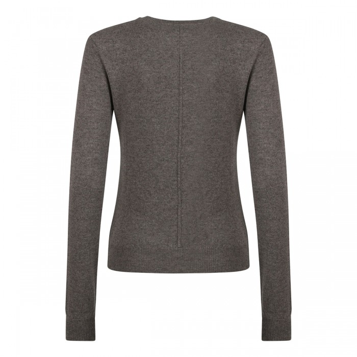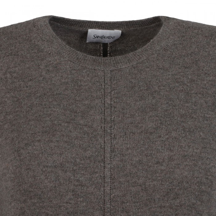 Taupe cashmere sweater from Saint Laurent featuring openwork detail, crew collar, long sleeves, ribbed-knit cuffs, neck and waist.