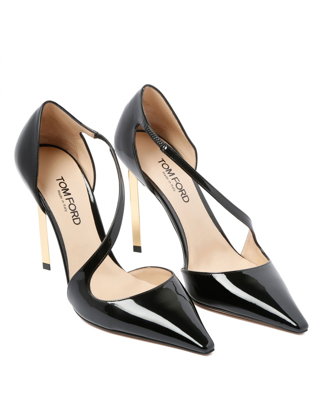 Black patent leather Newton pumps from Tom Ford featuring pointed toe silhouette, front strap with elastic insert, stainless steel 105 stiletto heel, nude leather lining, matching insole stamped with black logo, leather outsole.