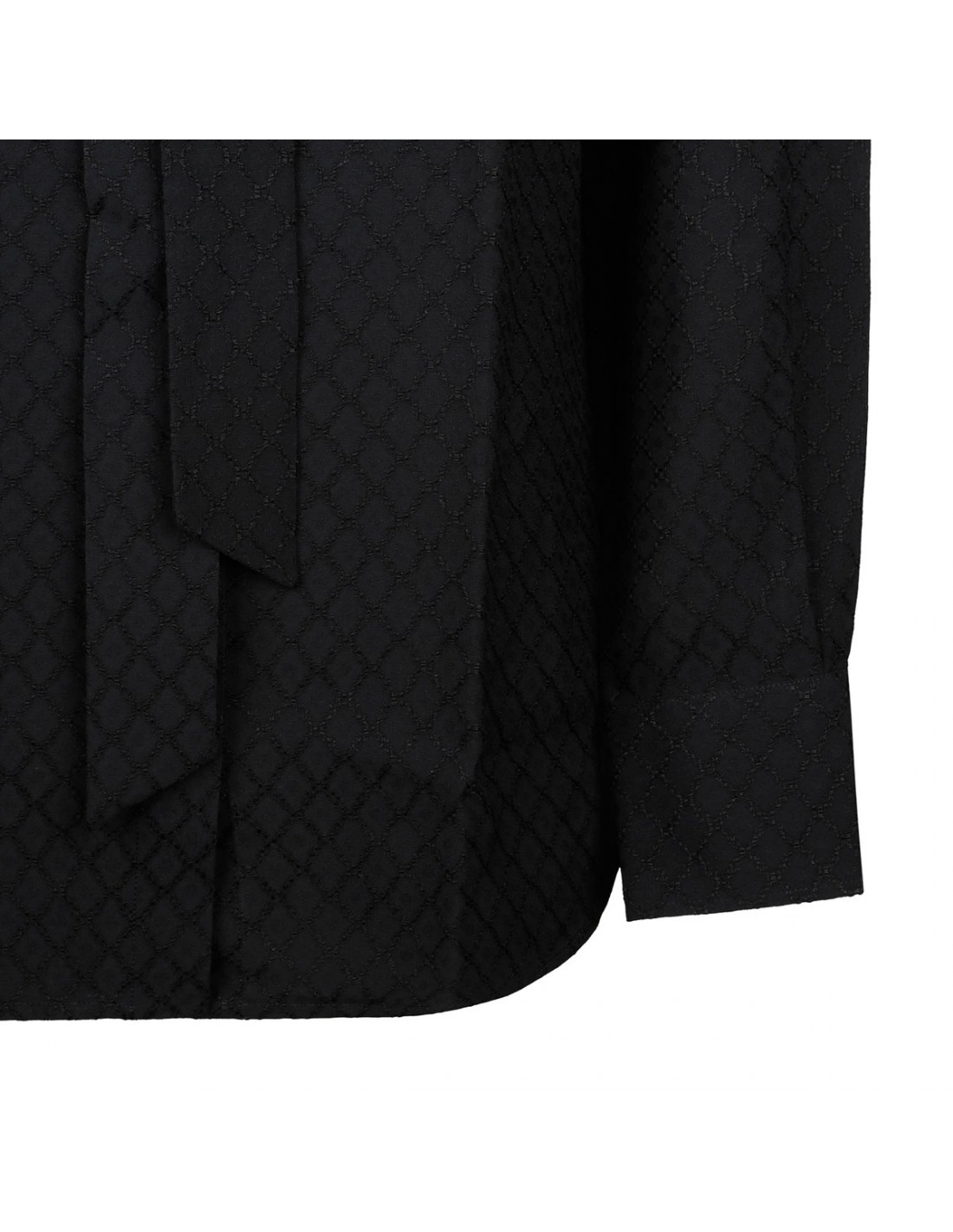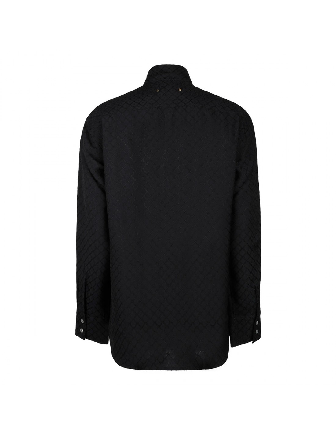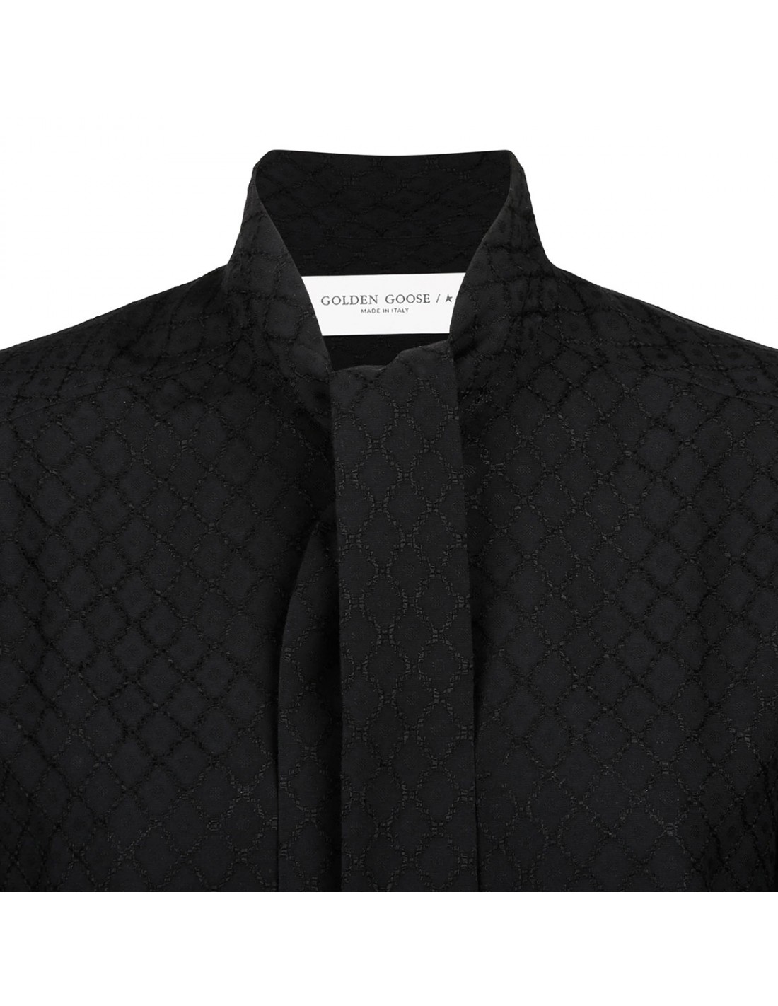 Black viscose shirt from Golden Goose featuring tonal jacquard motif, self-tie scarf at neck, long sleeves with buttoned cuffs, concealed fastening on front.