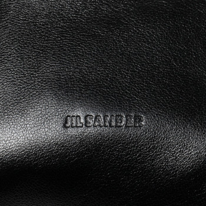 Black leather drawstring bag from Jil Sander featuring soft shape, drawstring fastening, leather shoulder straps, embossed Jil Sander logo and internal pocket.