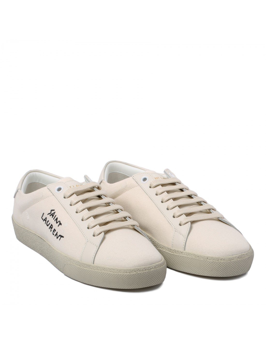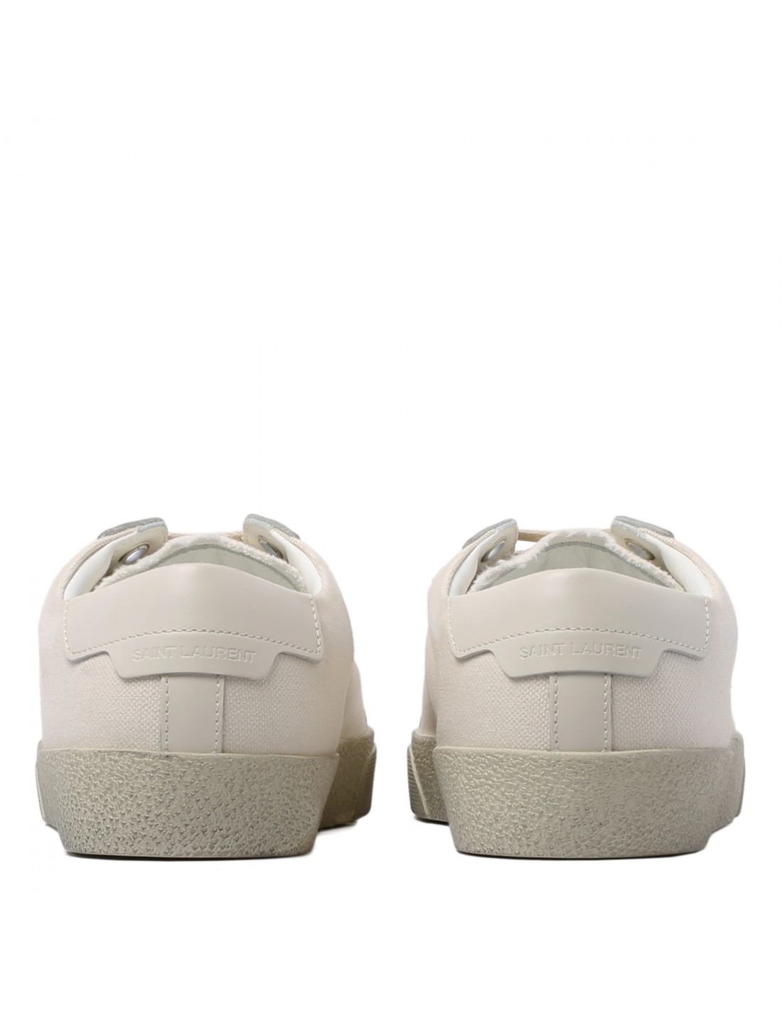 White organic cotton and leather Court Classic SL/06 sneakers from Saint Laurent featuring distressed detail, stitched logo along outer side, logo signature embossed back tab, round toe, lace-up closure, rubber sole.