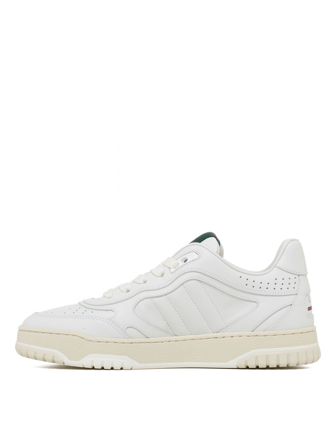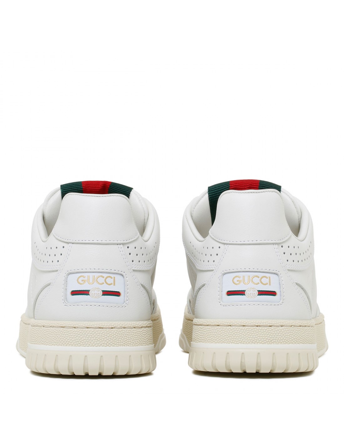 White leather Re-Web sneakers from Gucci featuring script logo and interlocking G Web tag, tongue with web, round toe, lace-up fastening, interlocking G details on the eyelets, stitching detailing recalling the web, padded collar, perforated toecap, tonale rubber outsole with interlocking G and script logo.