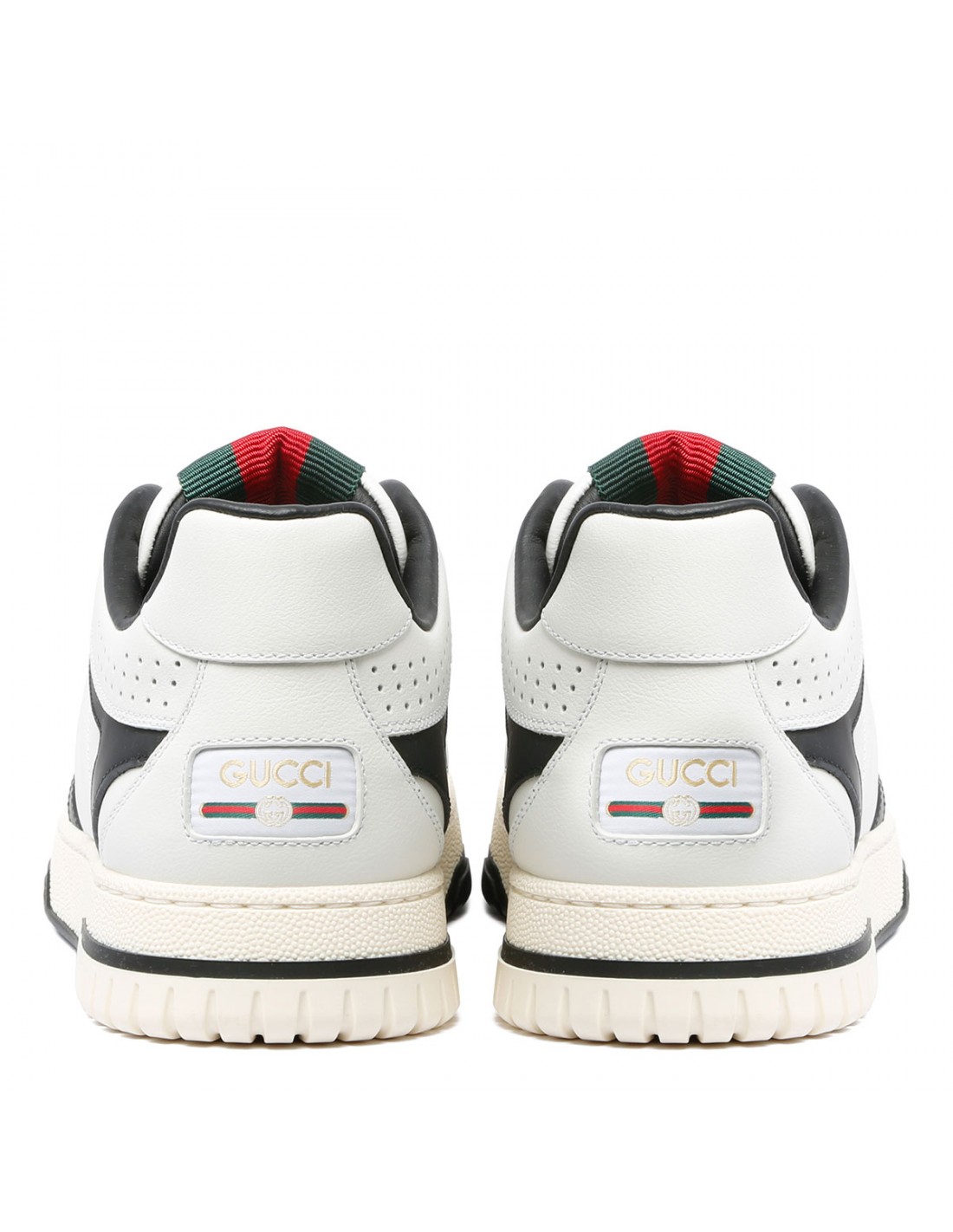 White leather Re-Web sneakers from Gucci featuring white suede trim, black leather detail, logo script and interlocking G Web tag, tongue with Web, lace-up fastening, interlocking G details on the eyelets, round toe, padded collar, rubber outsole with Interlocking G and script logo.