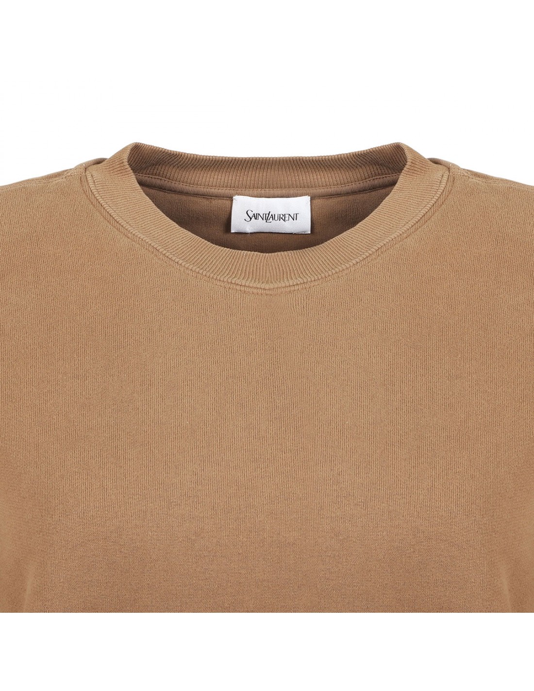 Dark beige fleece cotton sweatshirt from Saint Laurent featuring logo patch at hem, crew collar, long sleeves, ribbed-knit edges.