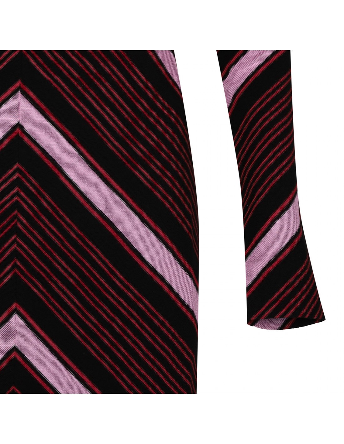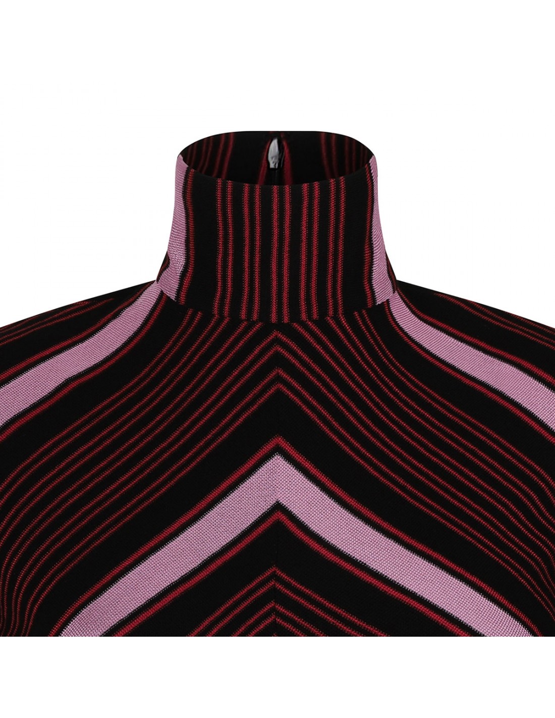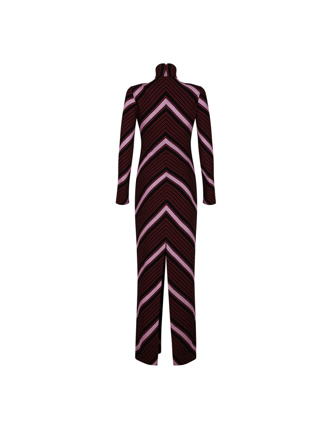 Black, pink and red knit cotton and viscose maxi dress from Missoni featuring chevron motif, turtleneck, long sleeves, split at frond and back, fitted silhouette.