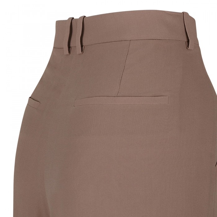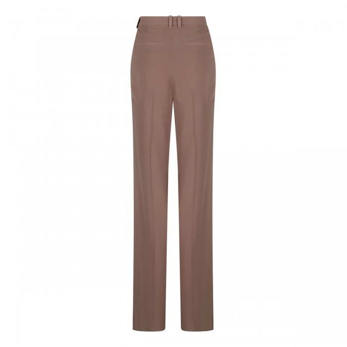 Cappuccino hue silk crepe pants from Saint Laurent featuring high waist, concealed front button, relaxed straight leg, hook and zip closure, side pockets, belt loops on the waistband, back pockets.