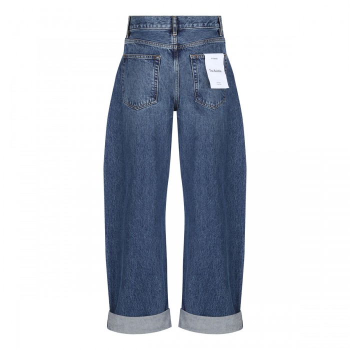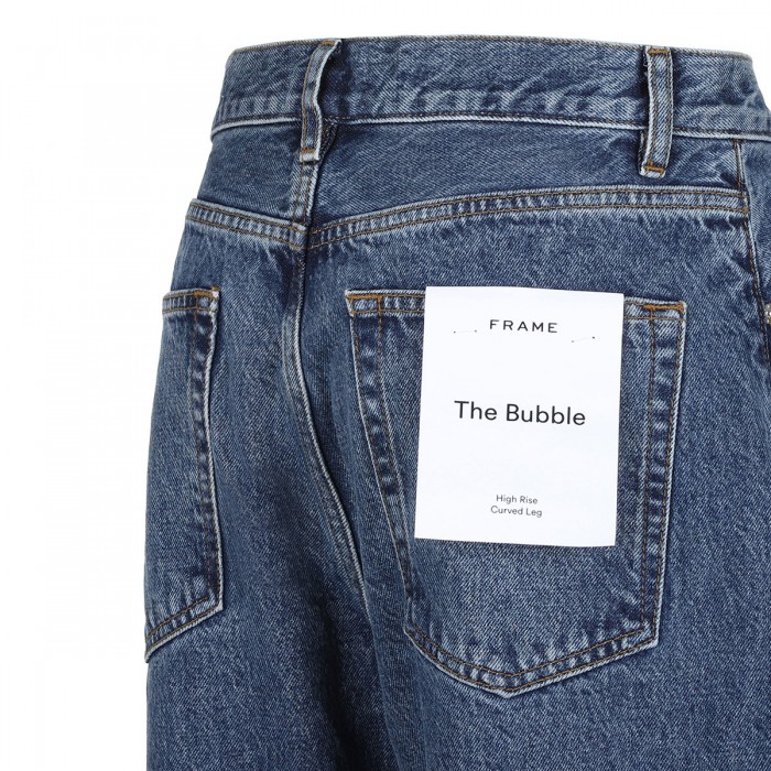 Blue rigid denim The Bubble jeans from Frame featuring barrel silhouette, high rise, curved outseam for a bubble effect, cuffed bottom, ankle length, button closure and zip fly, belt loops on the waist band, classic five-pocket style. The twice-rolled cuff can be unrolled.