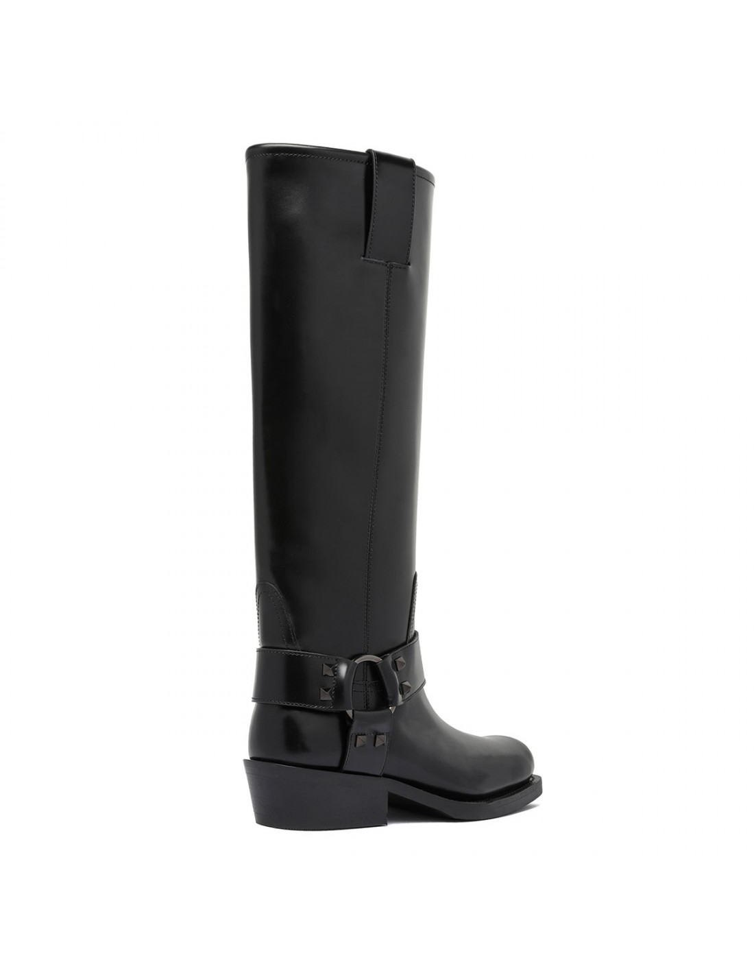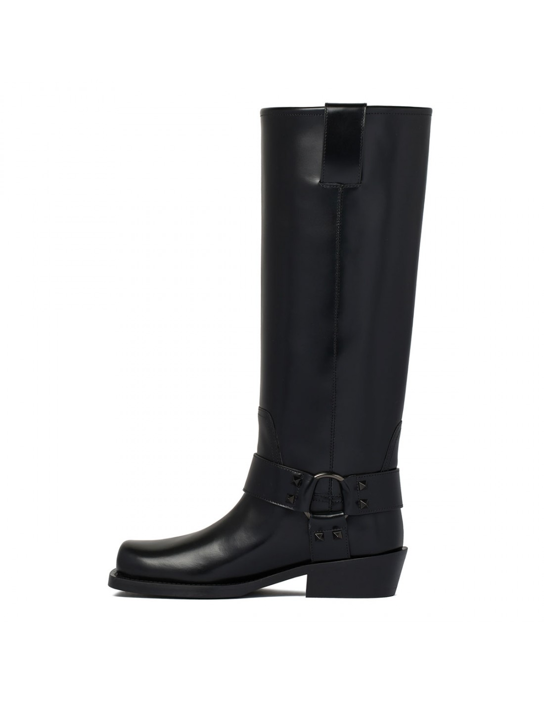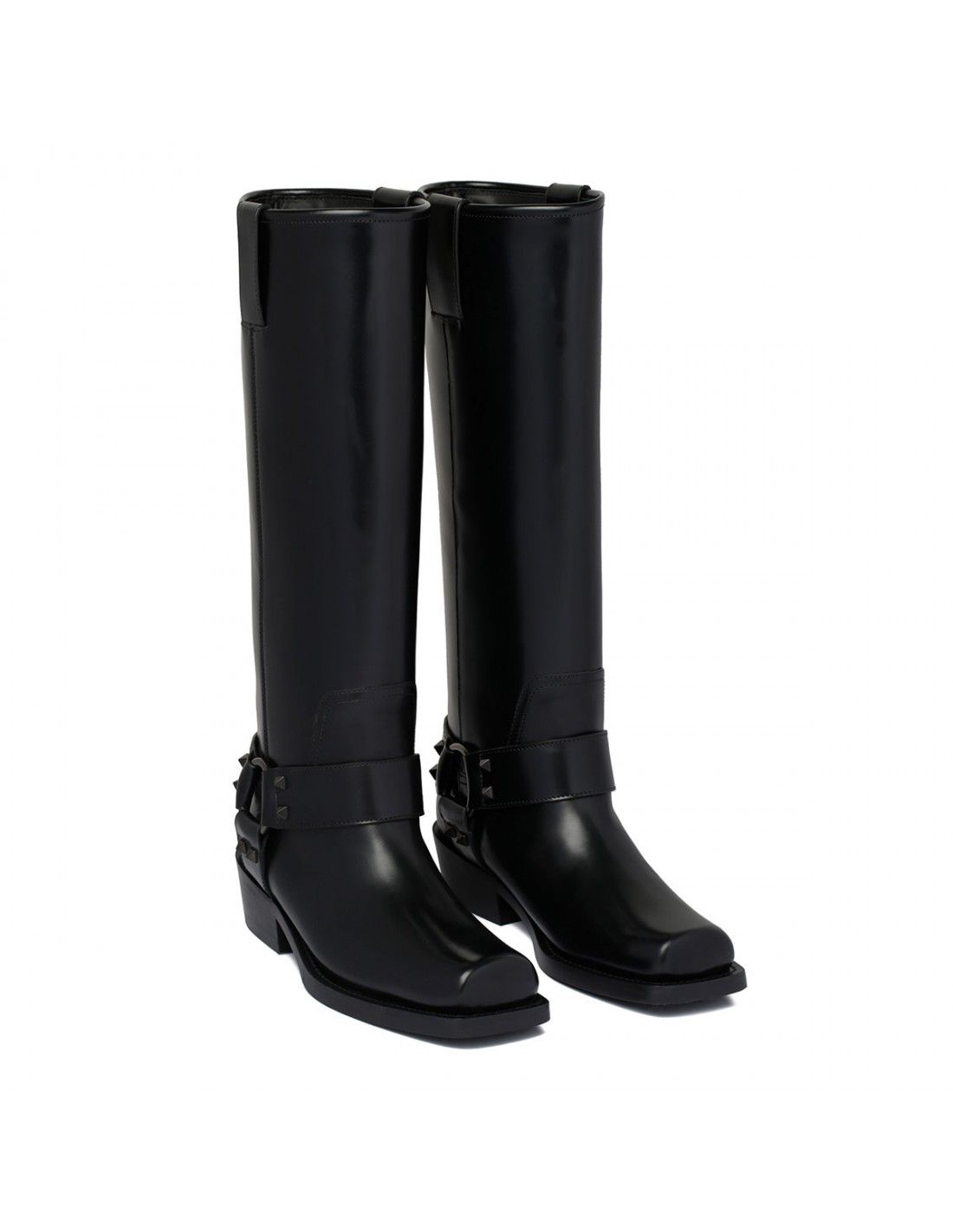 Black brushed leather Rockstud biker boots from Valentino Garavani featuring ruthenium-tone metal spikes decoration, square toe, double pull tab, harness detail with metal ring, leather lining and rubber sole.