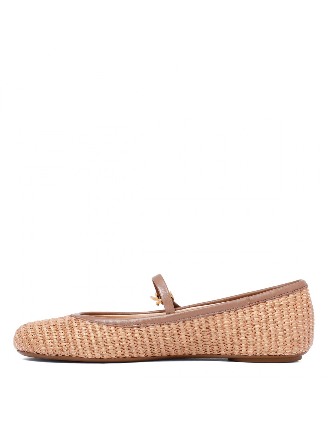 Tan hue leather and woven raffia fabric Carla flat ballerinas from Gianvito Rossi featuring Mary Jane strap with iconic Ribbon buckle closure, round toe, leather insole and rubber sole.