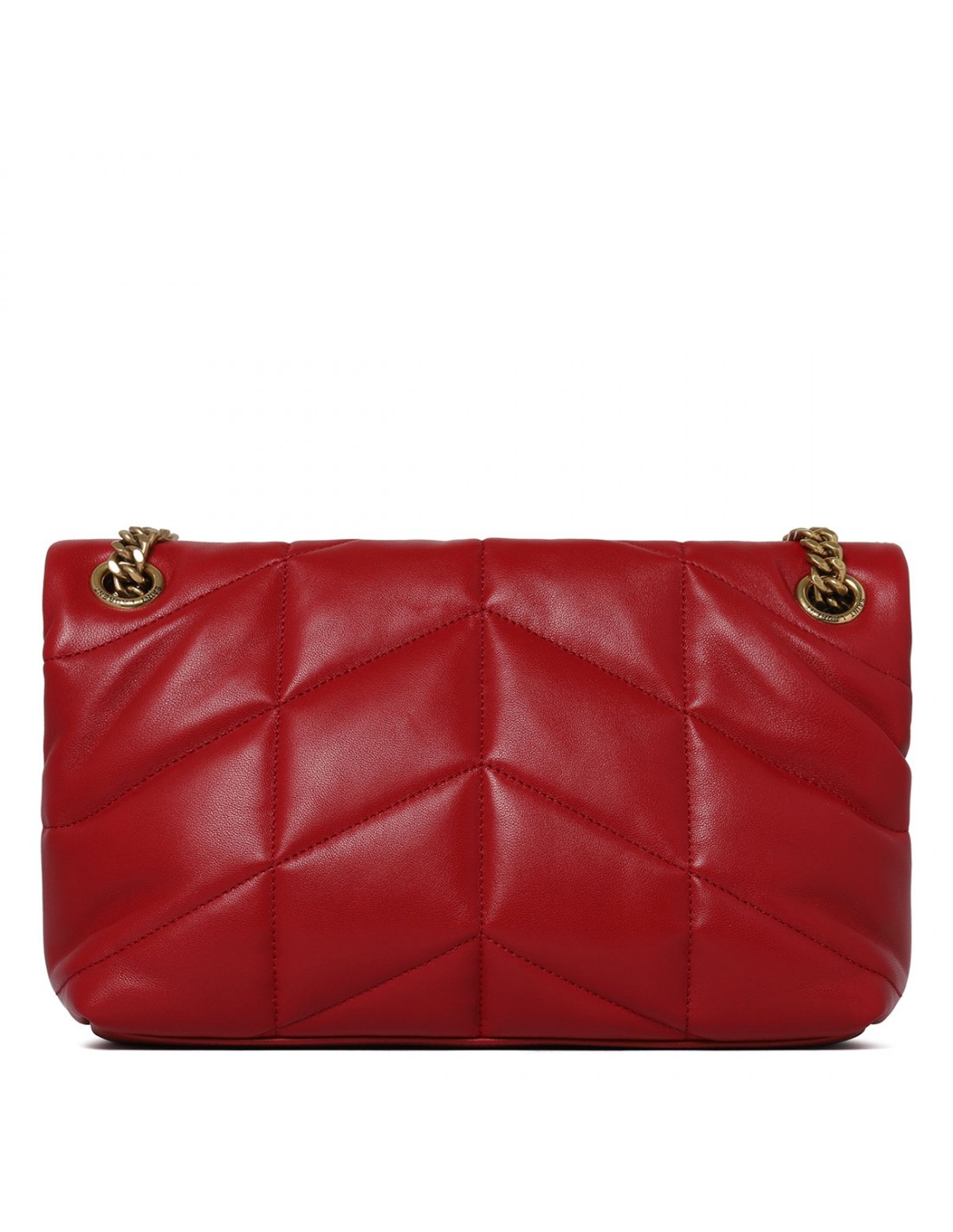 Red nappa leather Puffer small shoulder bag from Saint Laurent featuring bronze-toned interlaced YSL logo, chevron quilting, sliding chain strap, magnetic snap closure, grosgrain lining, one zipped pocket.