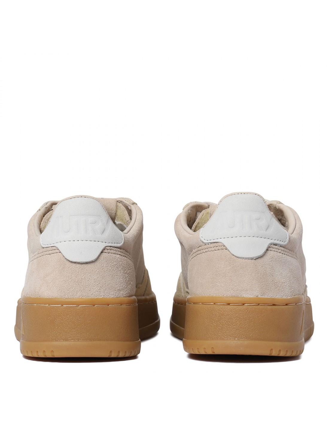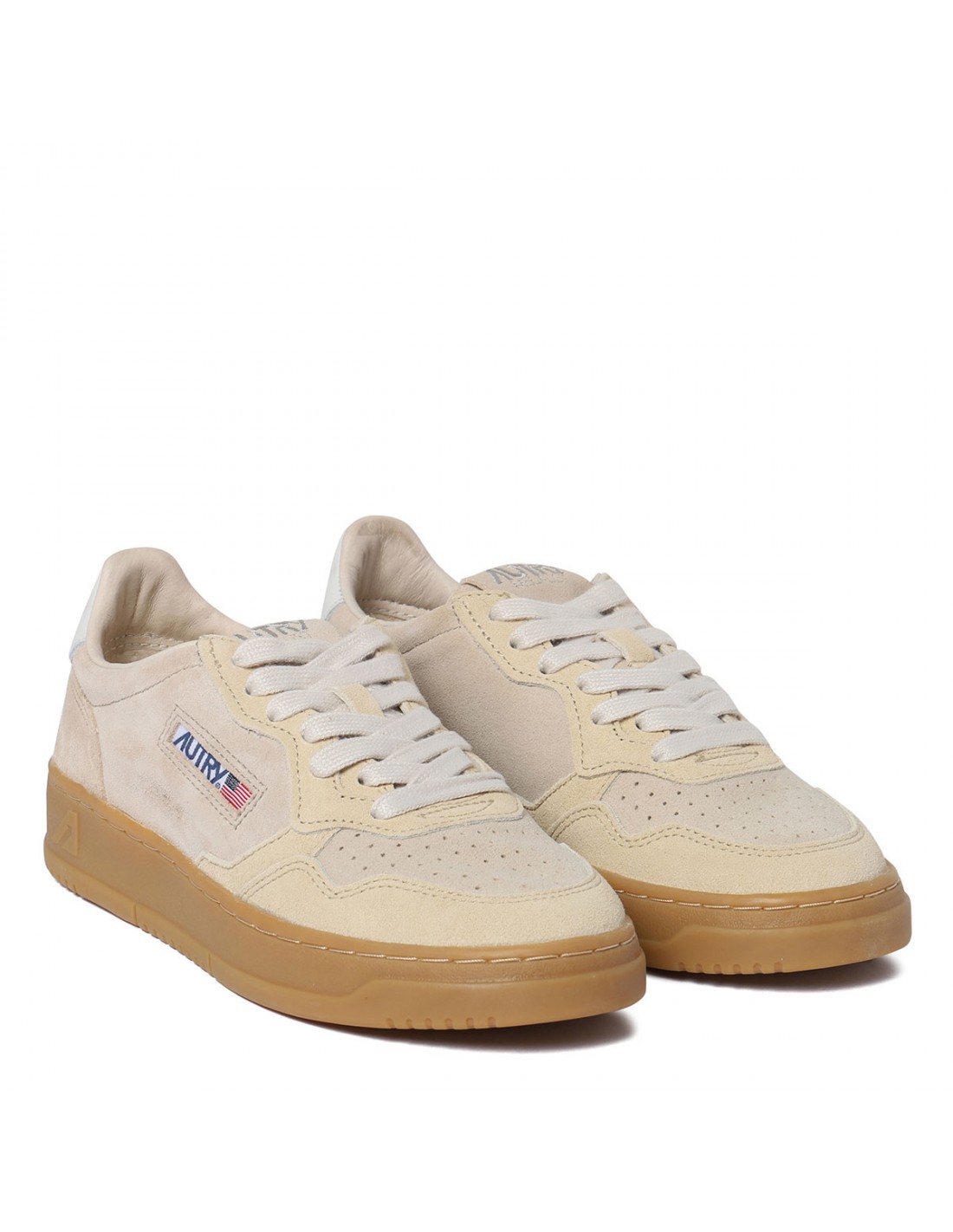 Sand suede and nubuck leather Medialist low top sneakers from Autry featuring contrasting heel tab with embossed logo, perforated toecap, round toe, lace-up closure, logo label on tongue, padded ankle collar, subtle distressed effect, leather insole, natural rubber sole.
