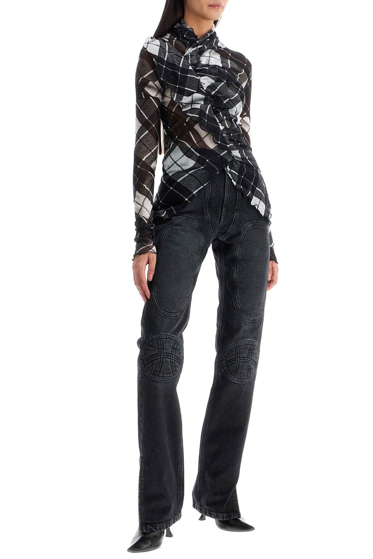 These Jean Paul Gaultier five-pocket jeans are made of black-washed denim, featuring padded inserts on the front and a lace-up closure at the back