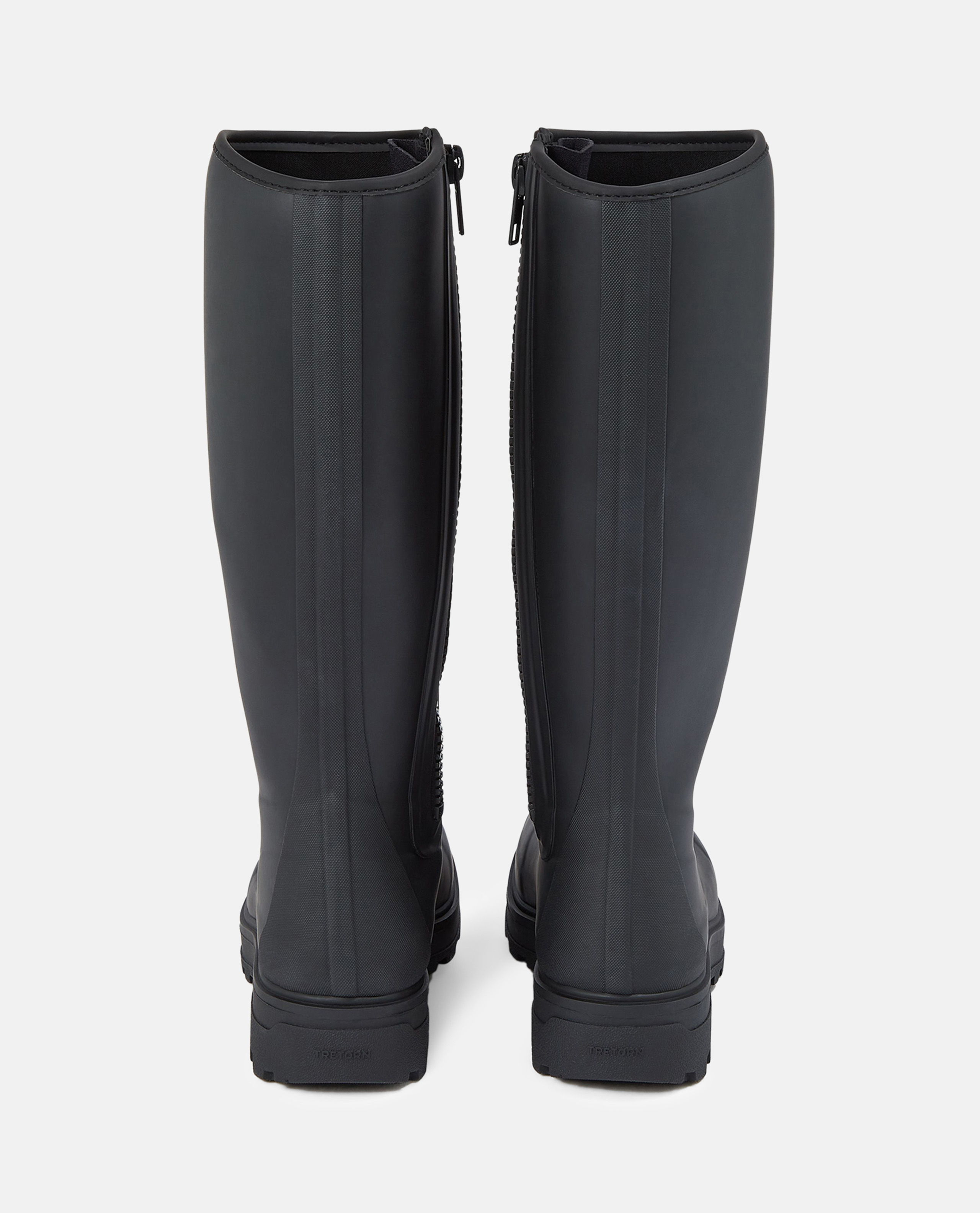 The ILSE in black is a high rubber boot. This extra-high boot has a line zip closure, and is crafted from TRETORN'S signature FSC- natural rubber. It has waterproof, quick drying recycled polyester and a robust outsole.