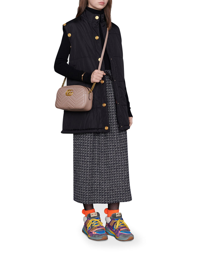 -Matelasse powder leather with chevron pattern and GG on the back -Antique gold-tone hardware -Double G -Internal open pocket -Adjustable chain shoulder strap, drop 60 cm The model can be worn crossbody. -Zip closure with elongated zip puller -Weight: approximately 394 g -Small size: L 24 cm x H 13 cm x D 7 cm -Made in Italy -The model is 180 cm tall -Can hold iPhone Pro Max/Plus, Airpods, small wallet and lipstick -Suede-effect microfibre lining