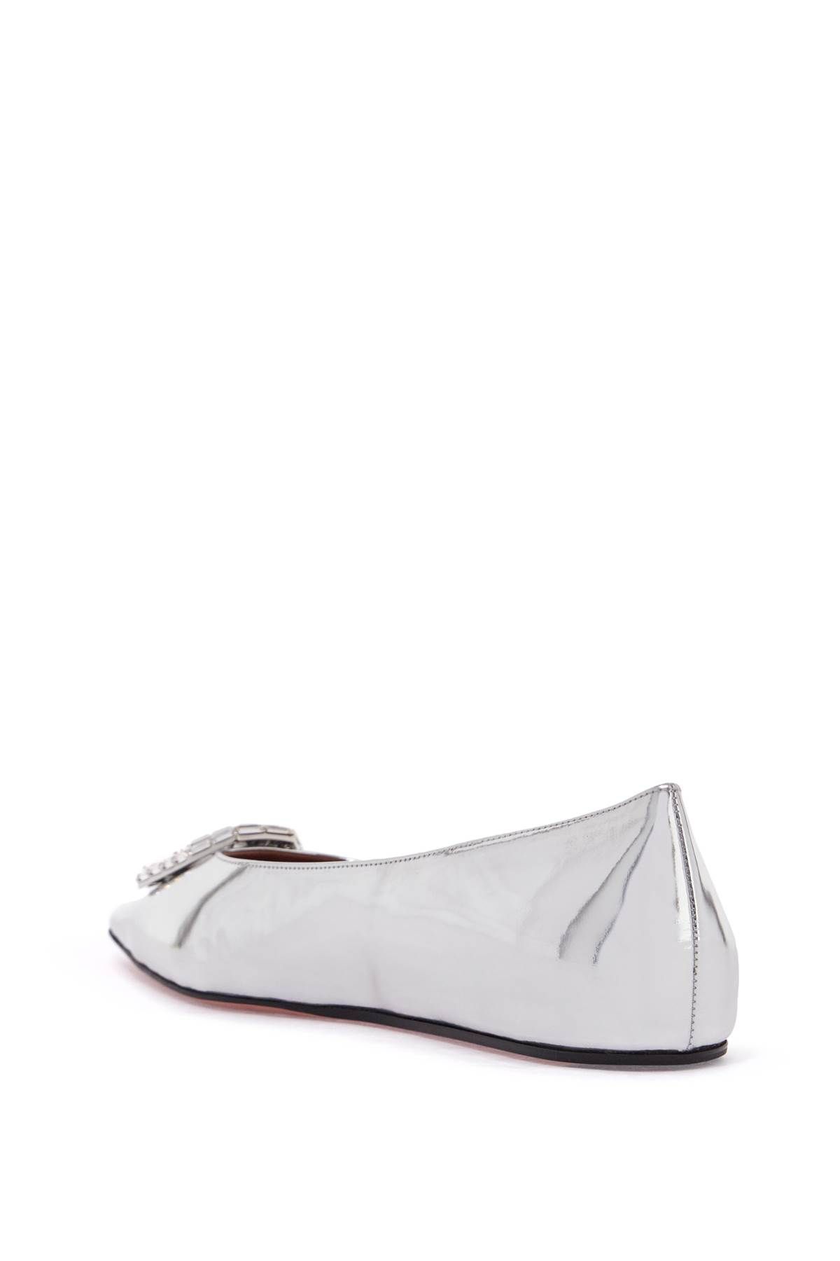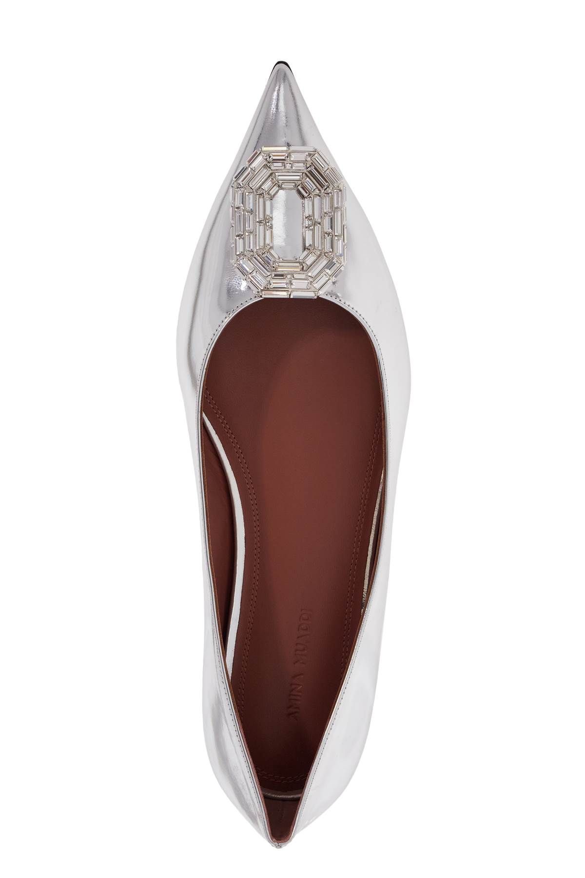 The Camelia ballerina flats by Amina Muaddi are made of metallic leather and feature a silver metal application with rectangular crystals on the toe
