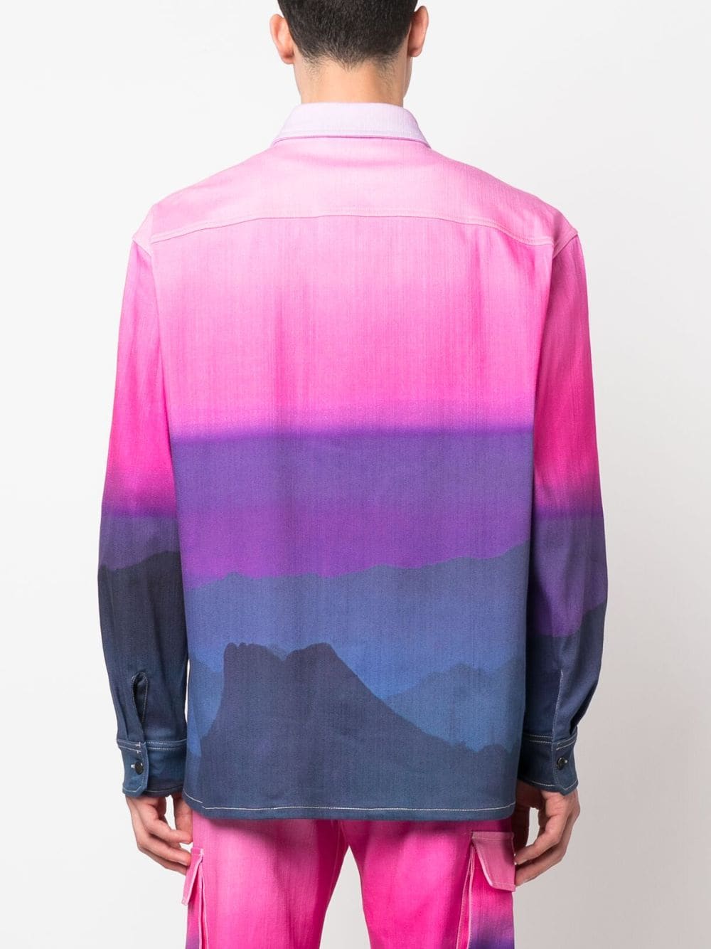 gradient-effect shirt jacket from BLUE SKY INN featuring fuchsia pink, stretch-cotton, tonal design, gradient effect, embroidered logo at the chest, pocket outline detail, classic collar, long sleeves, front button fastening and chest flap pocket.