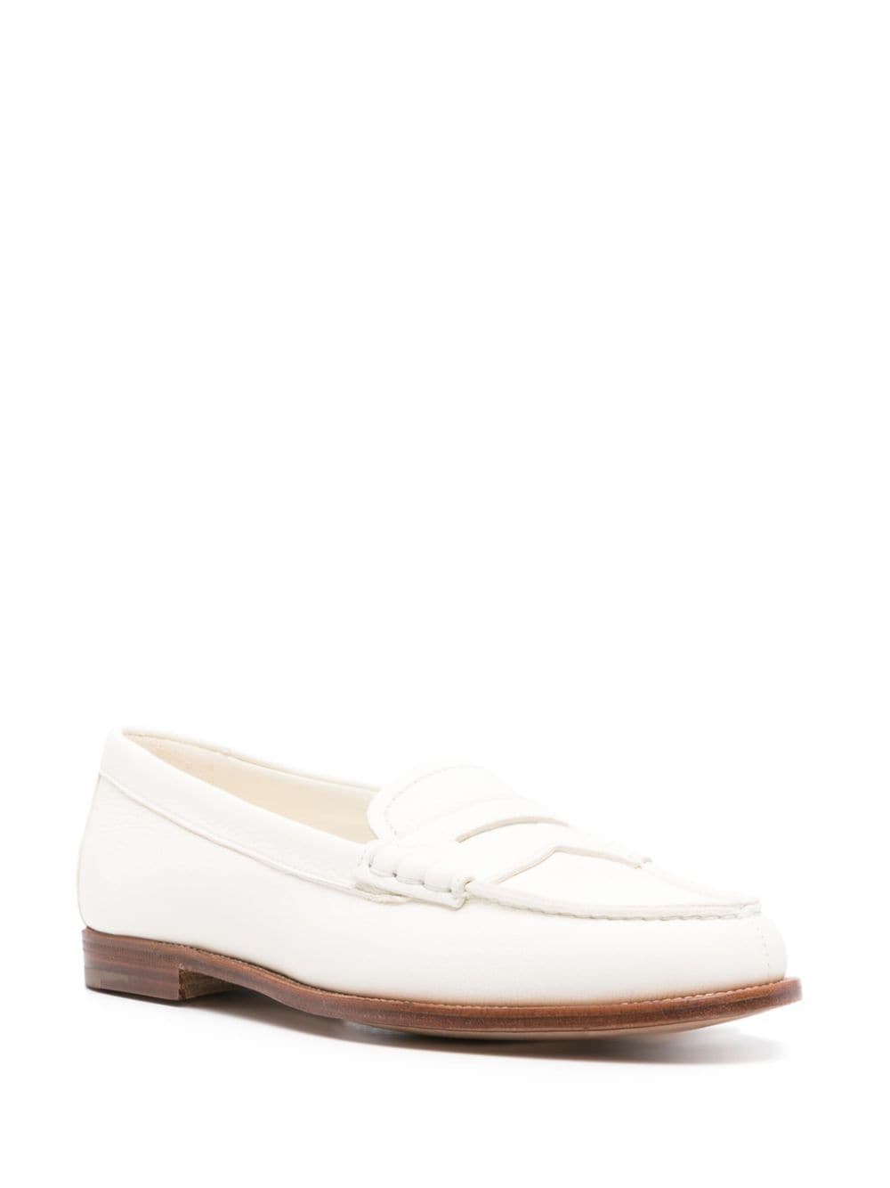 white calf leather grained texture penny slot slip-on style almond toe branded leather insole flat leather sole