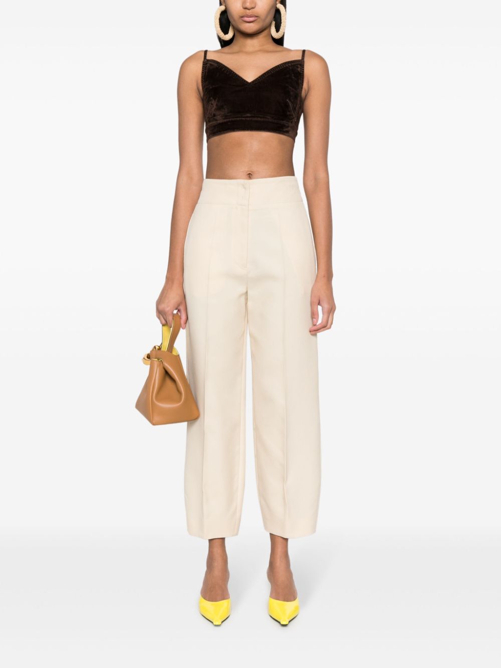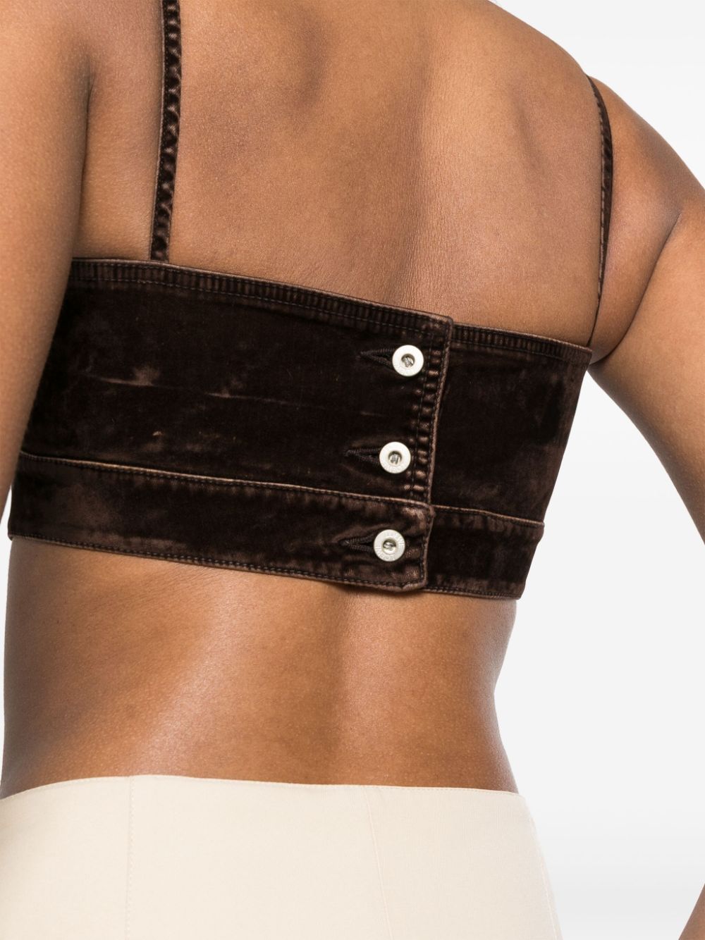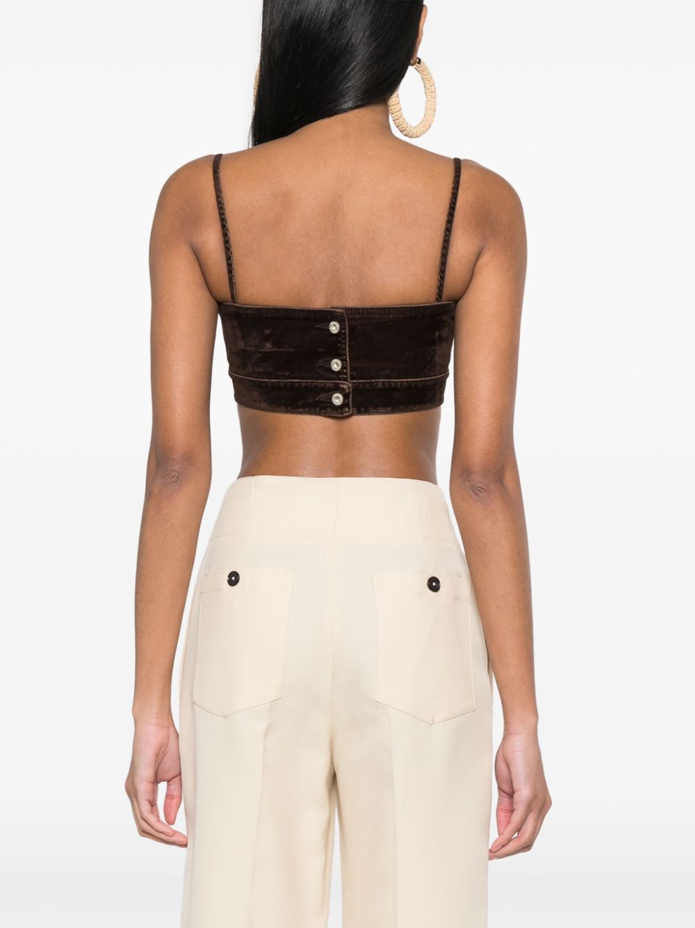 brown stretch-cotton velour V-neck sleeveless spaghetti straps rear button fastening cropped straight hem