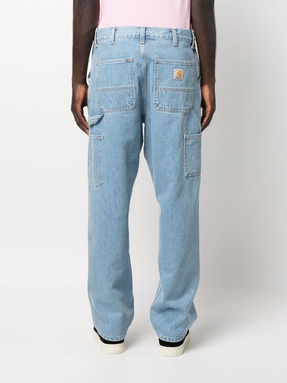 logo-patch straight-leg jeans from CARHARTT WIP featuring light blue, cotton, twill weave, stonewashed, logo patch to the rear, front button and zip fastening, two side slash pockets, two side patch pockets, two rear patch pockets, belt loops, straight leg and straight hem.
