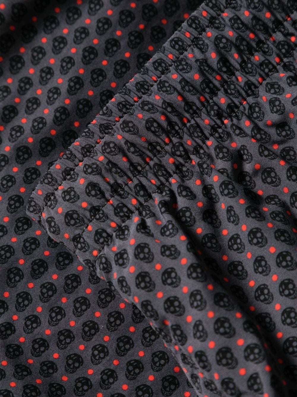 black/grey/red skull print embroidered motif elasticated waistband with internal drawstring straight leg two side slit pockets straight hem above-knee length mesh lining
