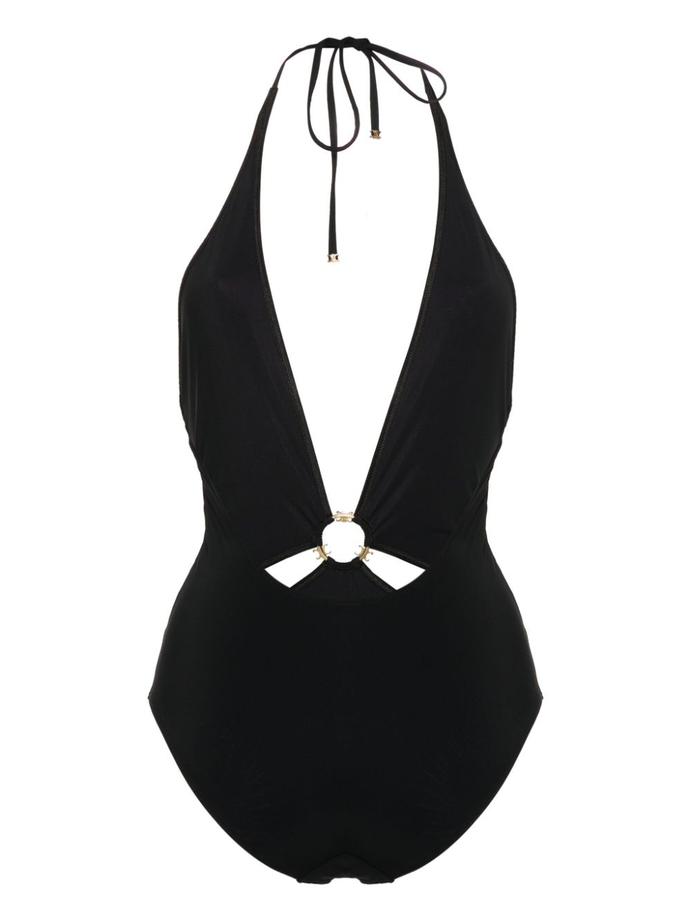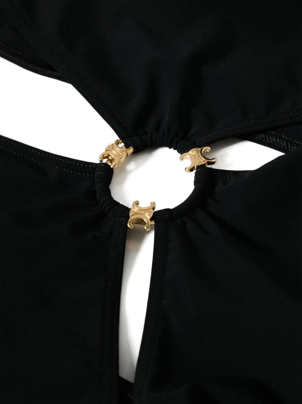 black stretch-design plunging V-neck sleeveless signature Triomphe motif cut-out detailing low back full lining halterneck tie fastening Be mindful to try on swimwear over your own garments.