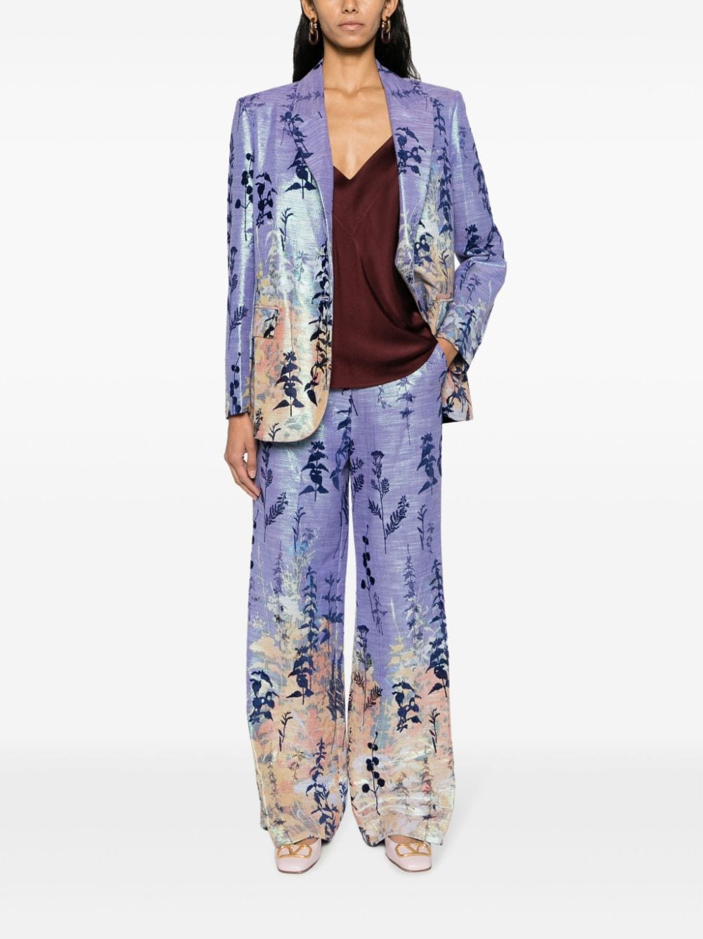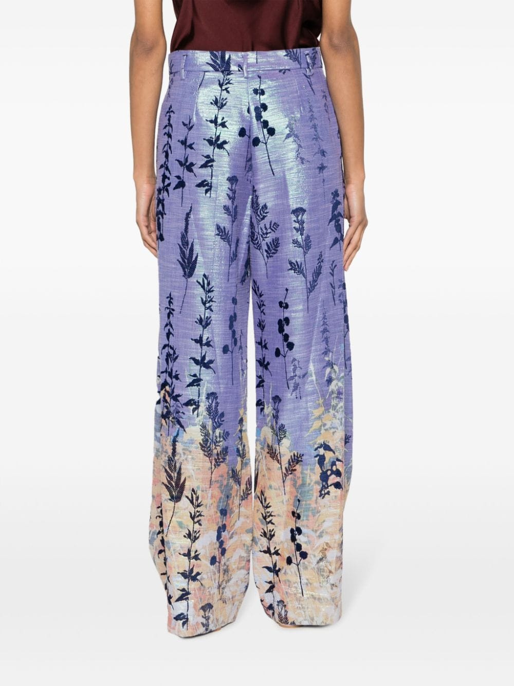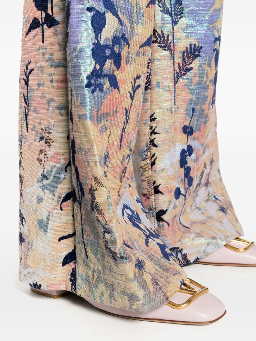 purple/multicolour patterned jacquard textured finish iridescent effect tonal stitching pressed crease dart detailing to the rear front button and concealed zip fastening high-waisted wide leg belt loops slip pockets to the sides straight hem