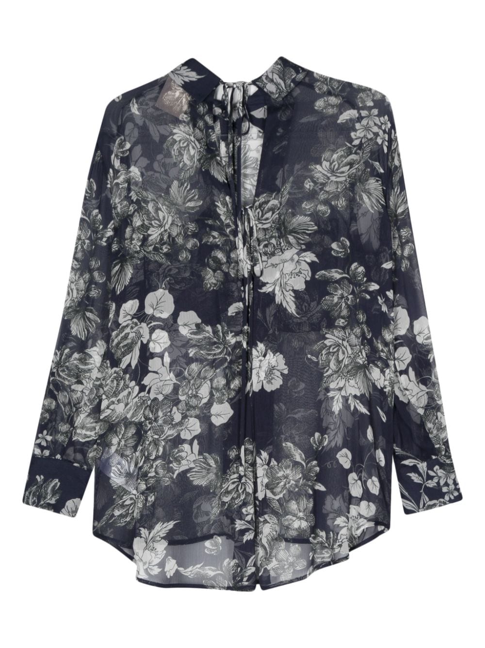 navy blue/black/white chiffon crepe semi-sheer construction classic collar two chest patch pockets long sleeves with pleat detailing buttoned cuffs curved hem rear multiple tie fastening
