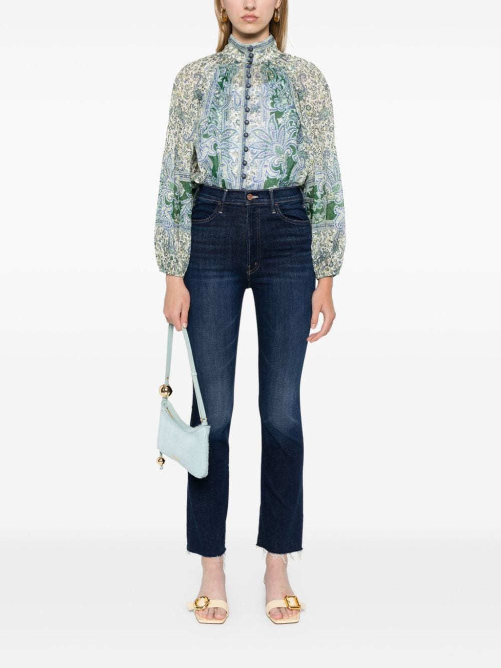 blue cotton blend denim whiskering effect belt loops classic five pockets raw-cut hem straight leg concealed fly and button fastening