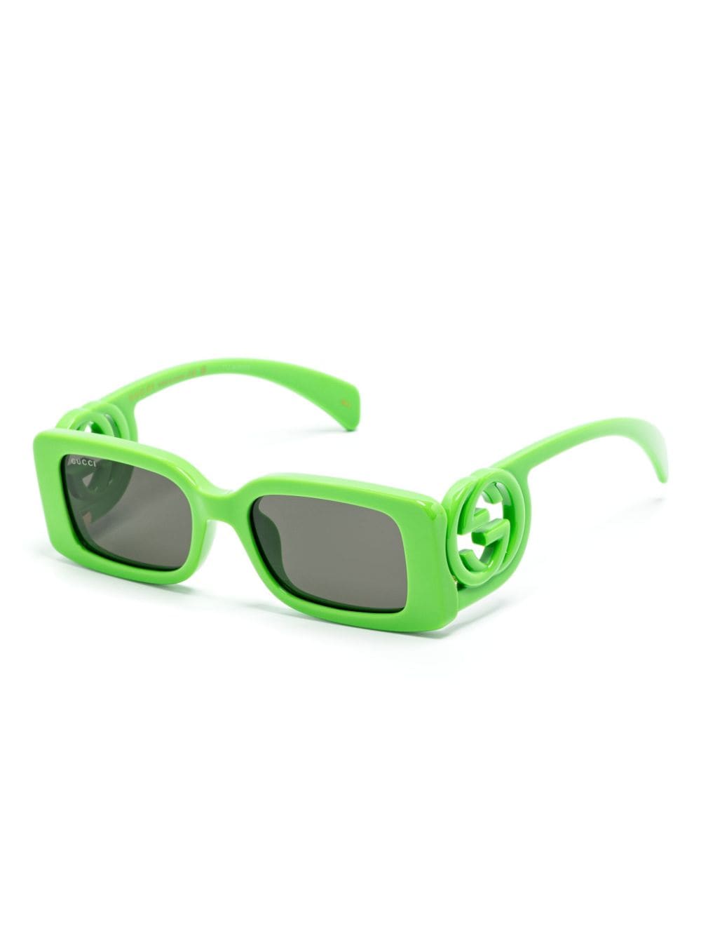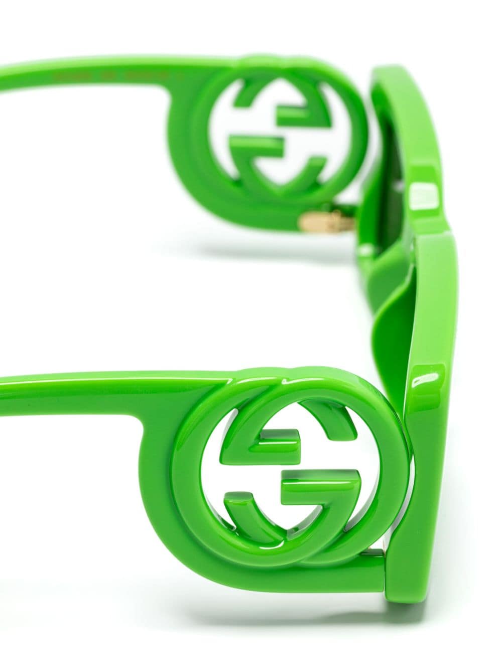 bright green acetate rectangle frame UV-protective grey tinted lenses logo lens decal signature Interlocking G logo to the side straight arms with curved tips These glasses come with a protective case.