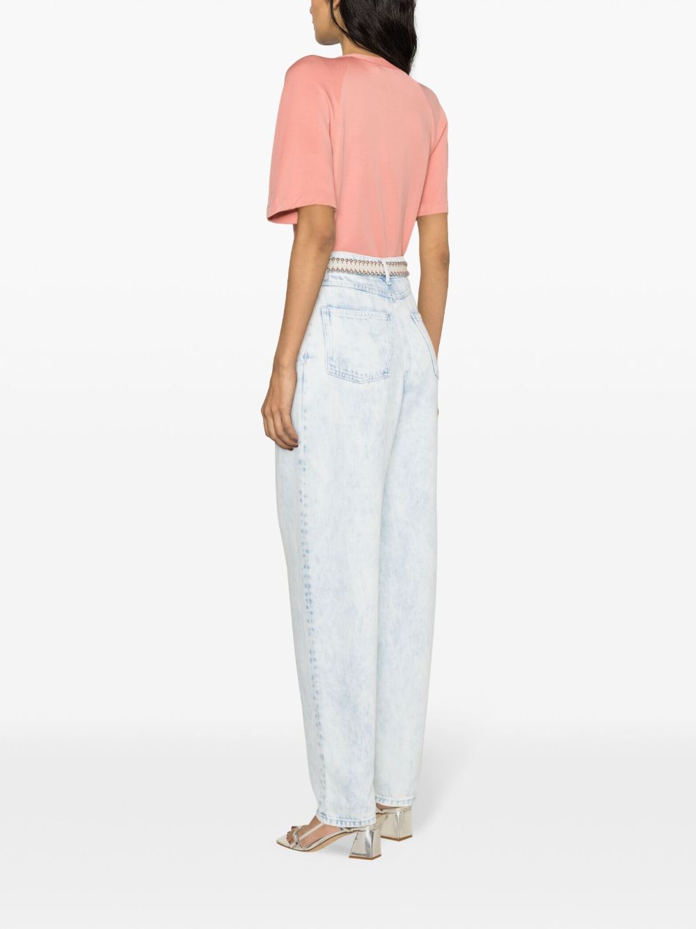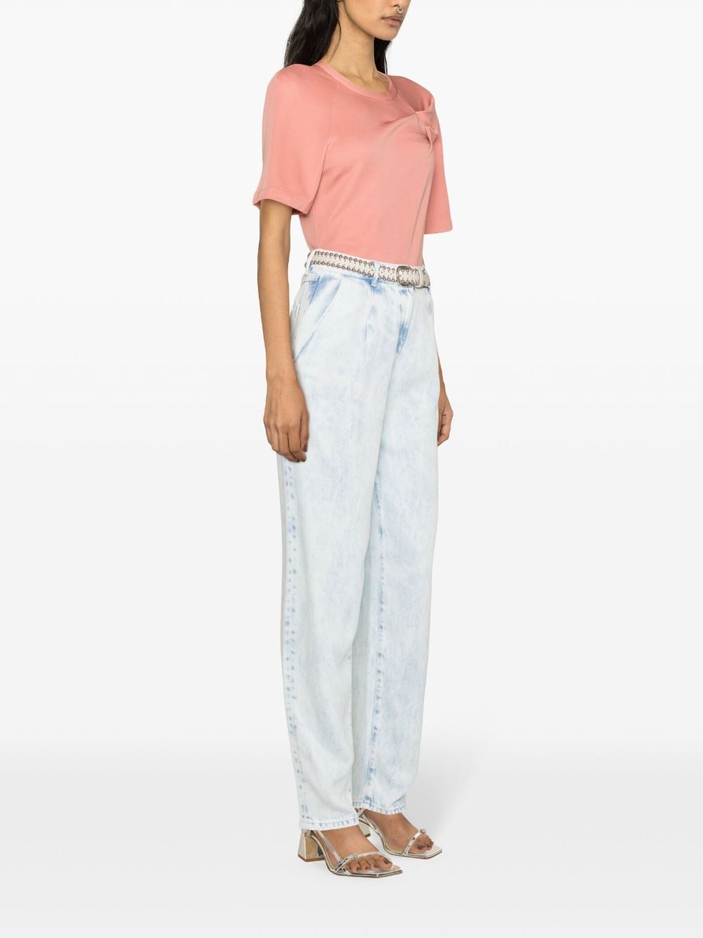 peach pink stretch-jersey fine ribbed pleat detailing round neck short raglan sleeves straight hem