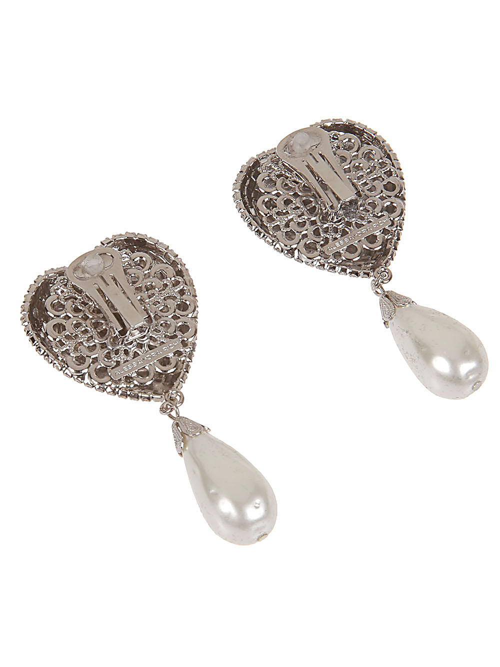 Silver, heart -shaped earrings, with pendant pearl, with clip closure rhinestone.