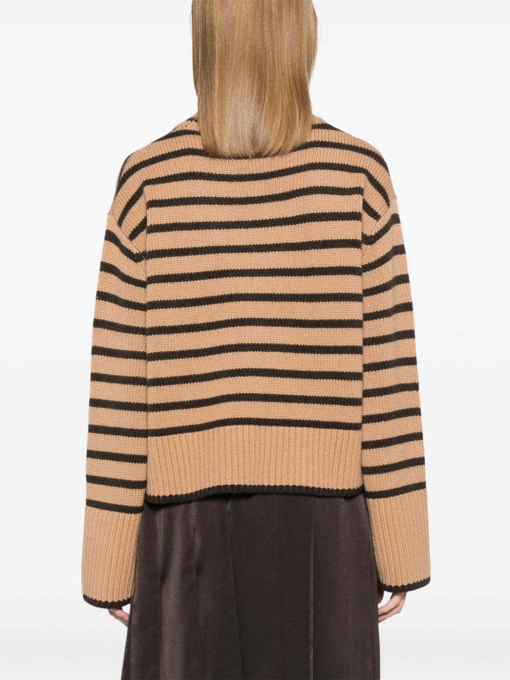 beige/brown cashmere knitted construction horizontal stripe pattern ribbed trim roll neck drop shoulder long sleeves straight hem