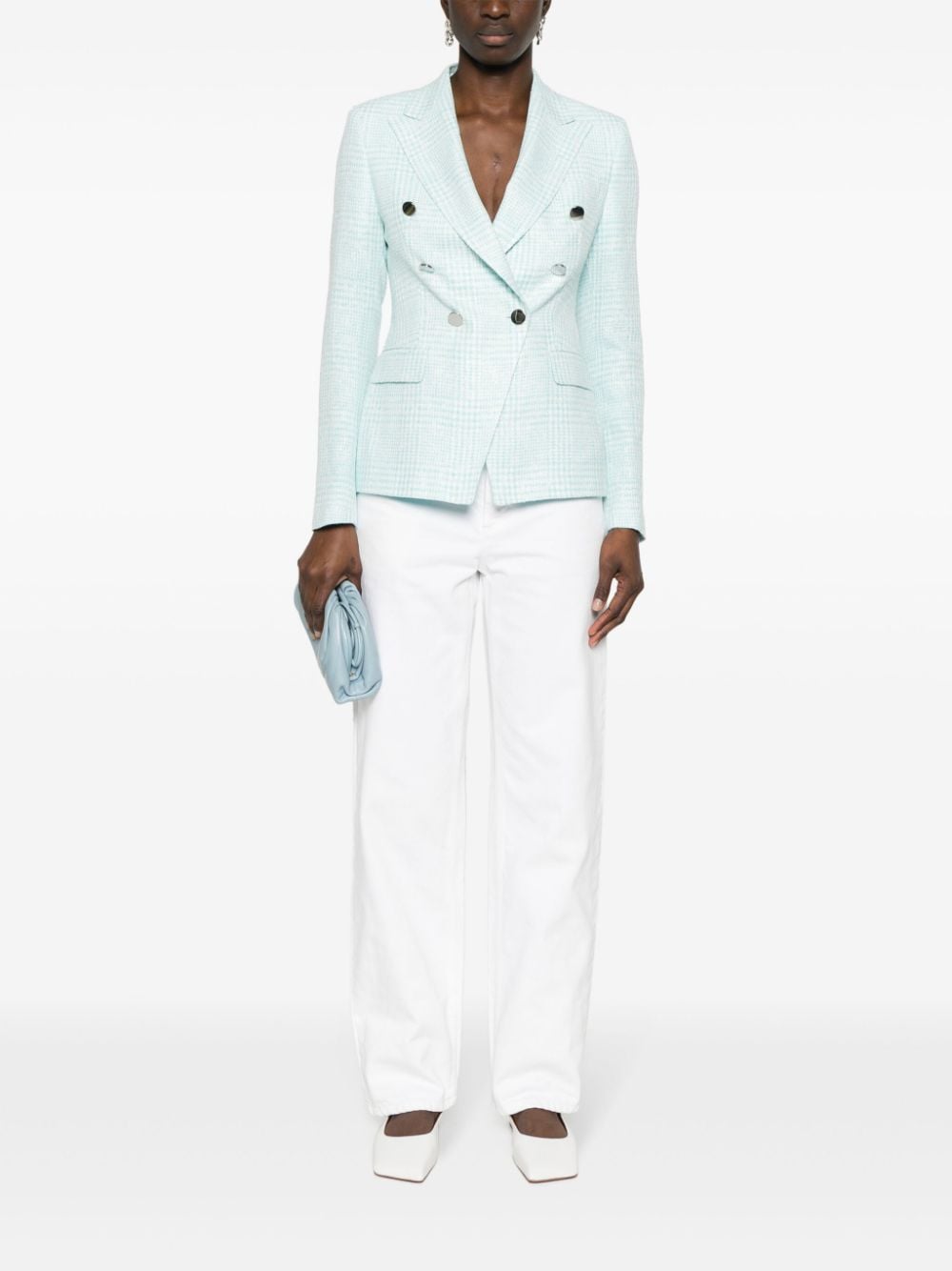 blue/white tartan check pattern peak lapels shoulder pads long sleeves faux-buttoned cuffs chest welt pocket two side flap pockets central rear vent internal logo tag full lining curved hem double-breasted button fastening