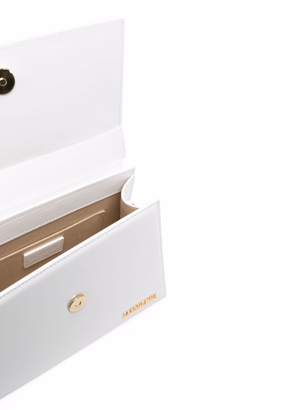 Optic white leather Le Grand Chiquito leather tote bag from JACQUEMUS featuring gold-tone logo lettering, gold-tone hardware, foldover top with magnetic fastening, single rounded top handle, adjustable detachable shoulder strap and main compartment.