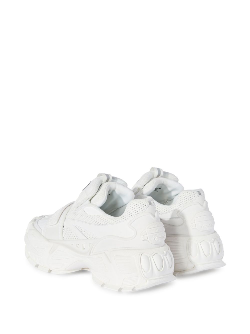 Glove slip-on sneakers from OFF-WHITE featuring white, panelled design, mesh panelling, logo patch at the tongue, logo-embossed strap, branded heel counter, round toe, front touch-strap fastening, pull-tab at the tongue, branded insole and chunky rubber sole.