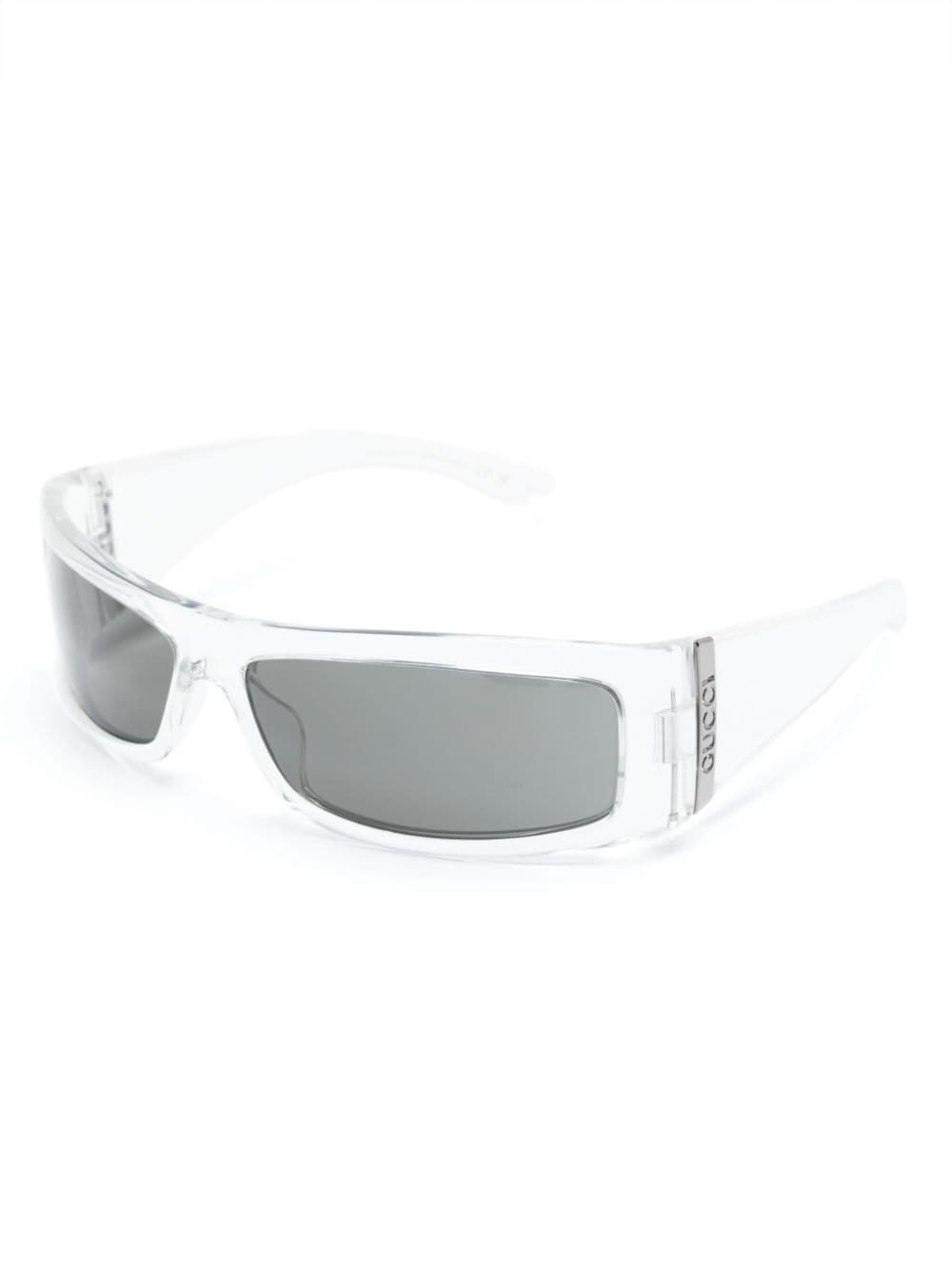logo-plaque rectangle-frame sunglasses from GUCCI EYEWEAR featuring transparent design, acetate, rectangle frame, grey tinted lenses, logo plaque at the arm, straight arms and curved tips. These glasses come with a protective case..
