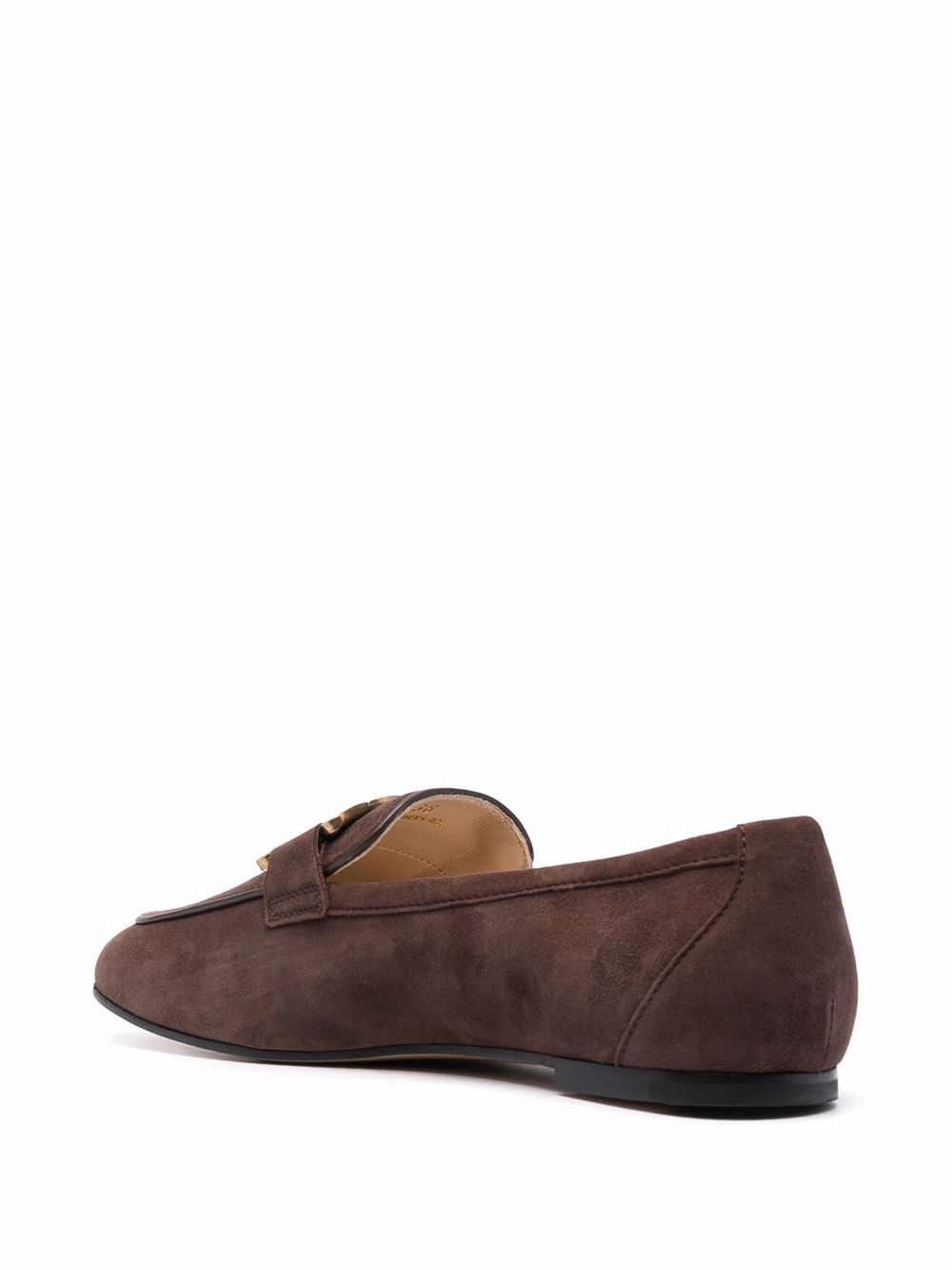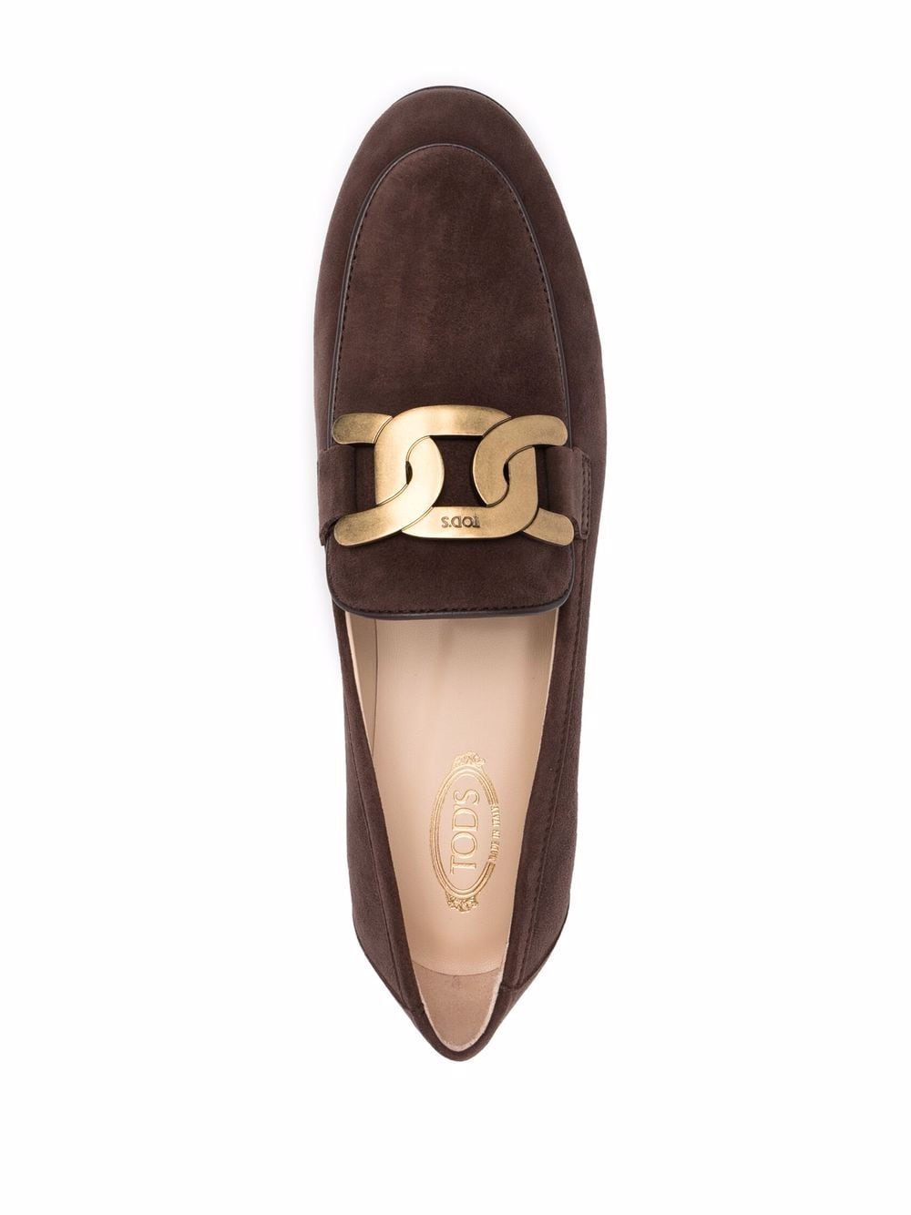 Dark brown leather/suede chain-plaque suede loafers from TOD'S featuring almond toe, gold-tone logo plaque, branded insole and flat rubber sole.