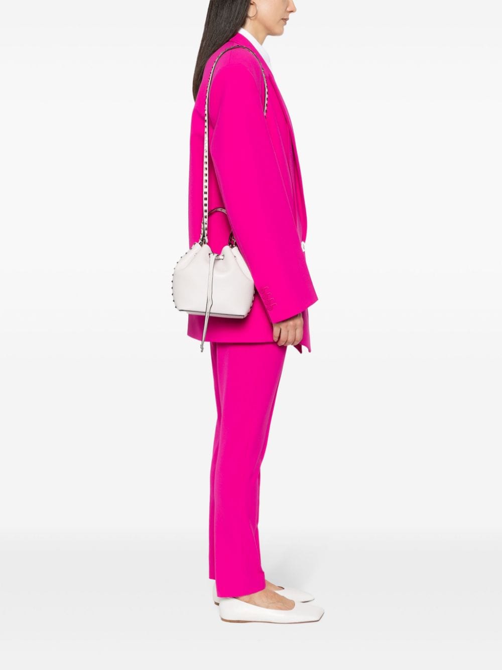 lilac leather pebbled texture gold-tone Rockstud embellishment single flat top handle detachable shoulder strap logo print to the front main compartment internal logo patch suede lining drawstring fastening This piece comes complete with a protective dust bag.
