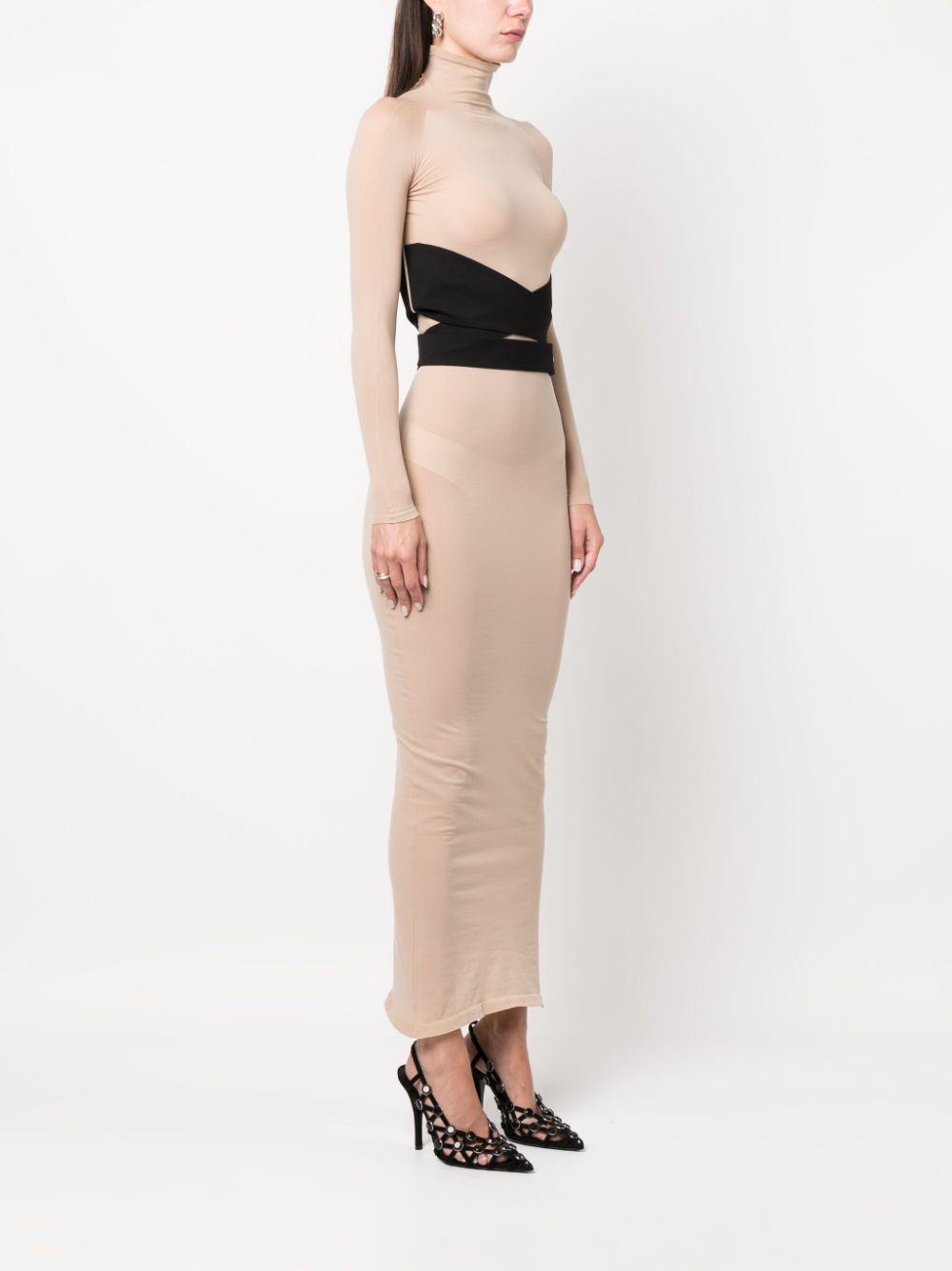 Second Skin logo-waistband knit maxi dress from Alaia featuring taupe, jet black, jersey knit, stretch-design, semi-sheer construction, crossover strap detail, high neck, elasticated logo waistband, front touch-strap fastening, long sleeves, straight hem and ankle-length.