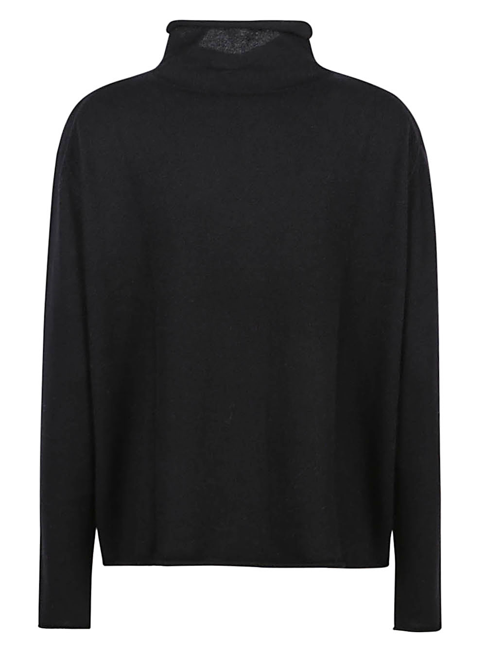 Sweater with straight fit, low shoulders and mock neck with raw hem.